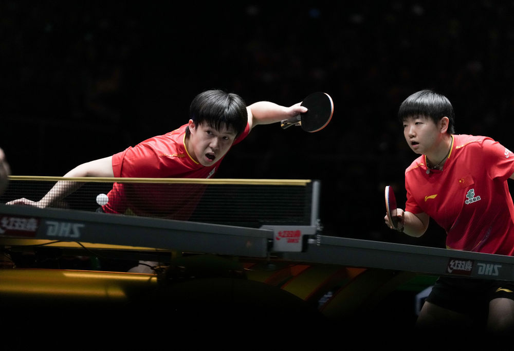↑ 中国队组合王楚钦(左)/孙颖莎在混双比赛中。他们3比0战胜日本队组合松岛辉空/大藤沙月。 新华社记者 王曦 摄