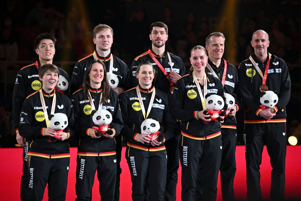 ↑ 季军德国队在颁奖仪式上合影。中国 新华社记者 胥冰洁 摄