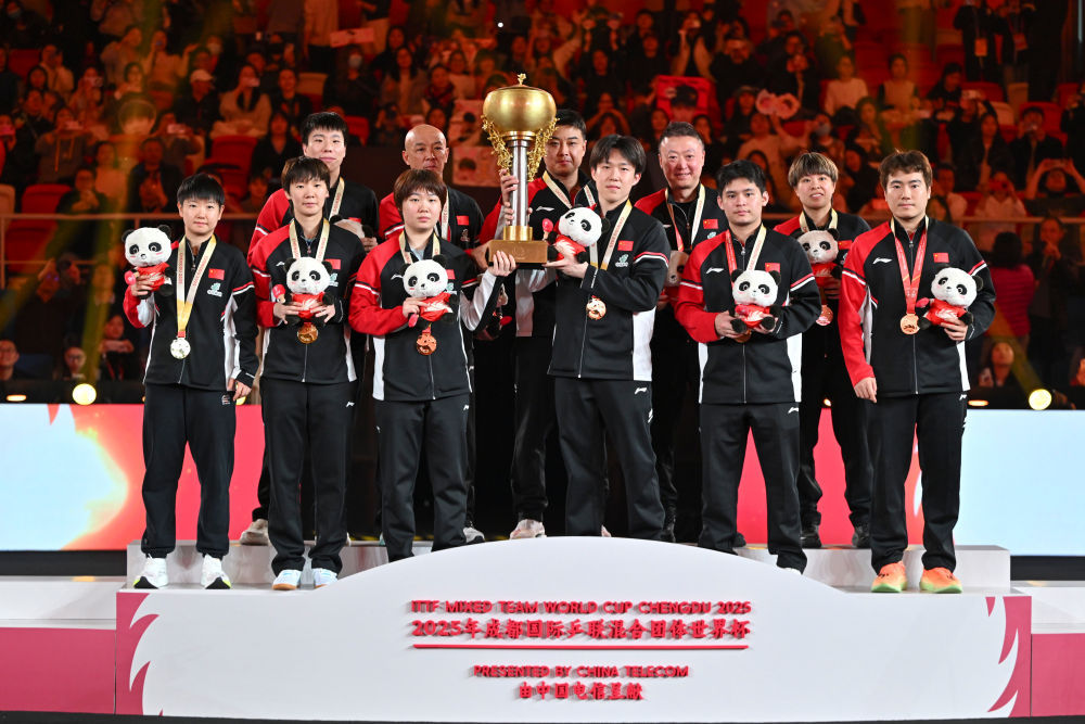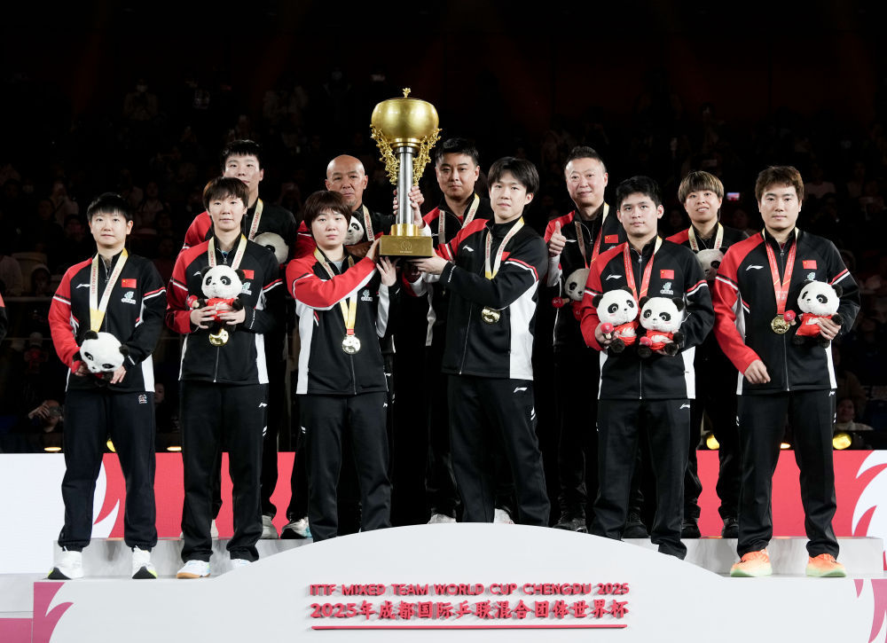 ↑ 冠军中国队在颁奖仪式上举起奖杯。乒乓 新华社记者 王曦 摄