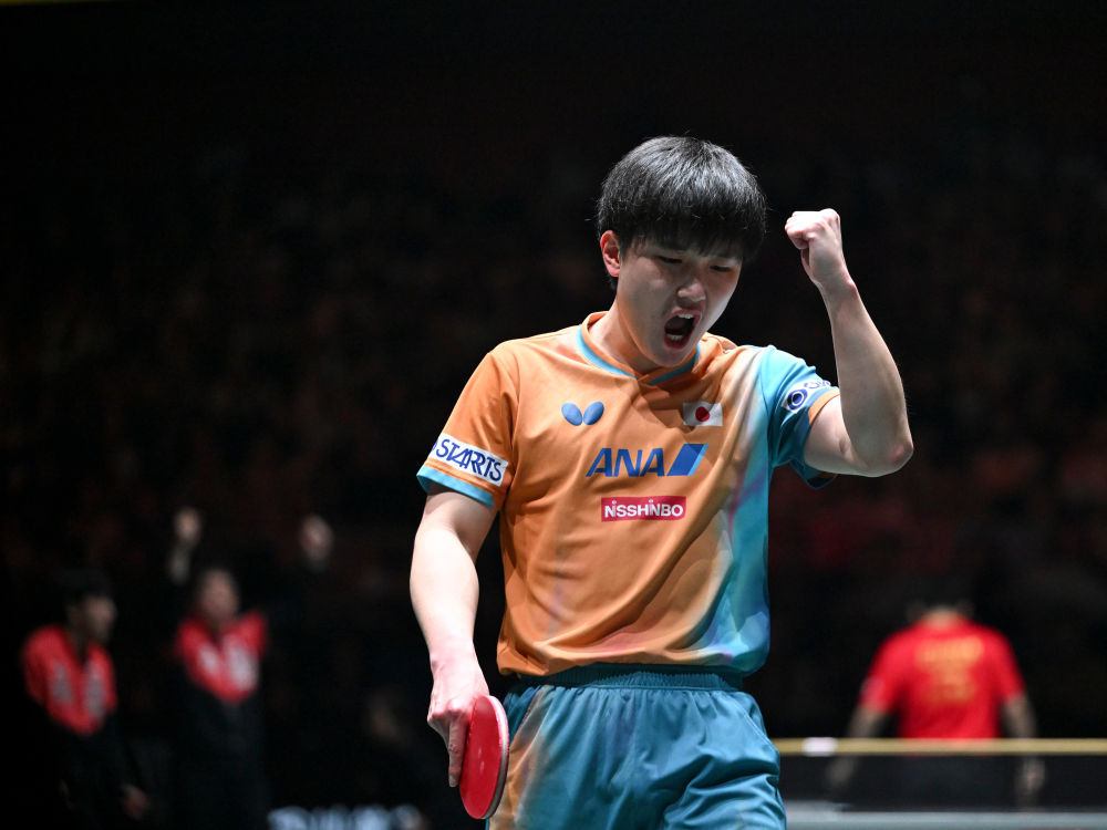 ↑ 日本队选手张本智和在男单比赛中庆祝得分。他1比2不敌中国队选手林诗栋。 新华社记者 胥冰洁 摄