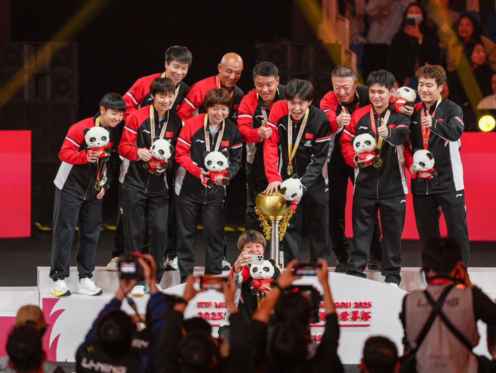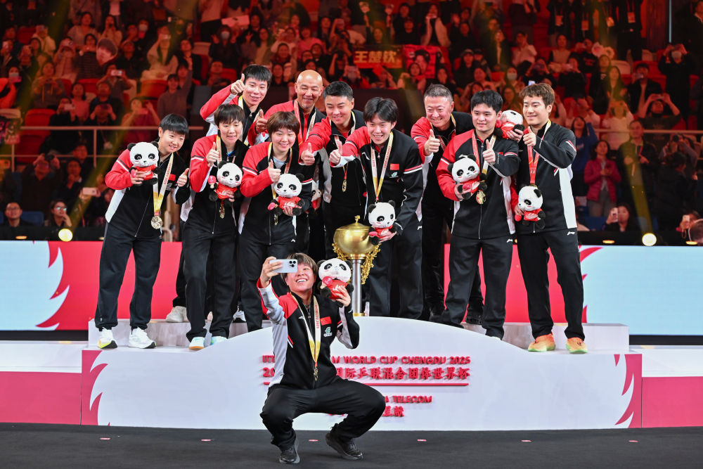 ↑ 冠军中国队在颁奖仪式上自拍留念。乒乓WhatsApp%E3%80%90+86%2015855158769%E3%80%91ls%20engine%20hoist%20plate 新华社记者 王迎 摄