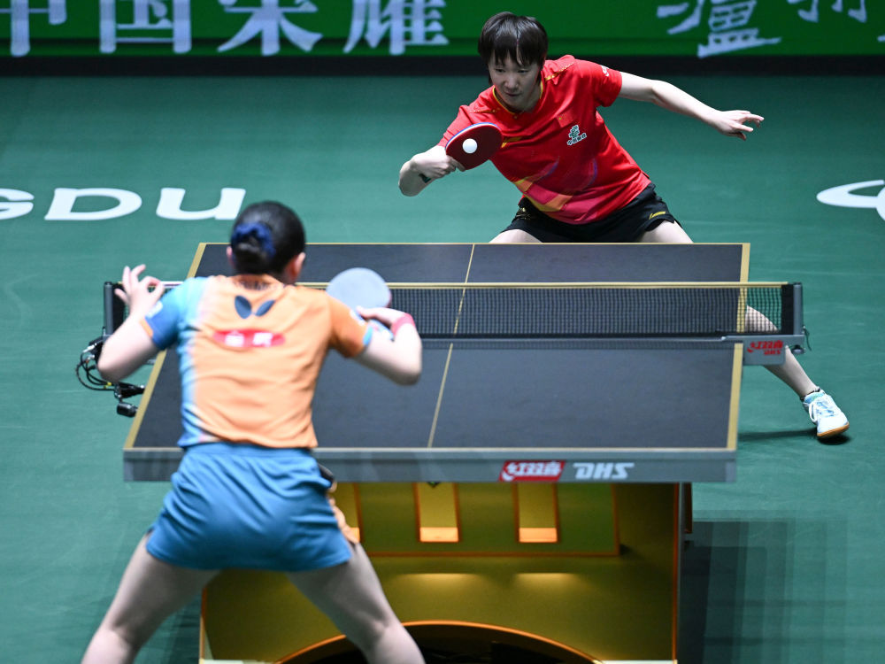 ↑ 中国队选手王曼昱(左)在女单比赛中回球。她3比0战胜日本队选手张本美和。 新华社记者 王曦 摄