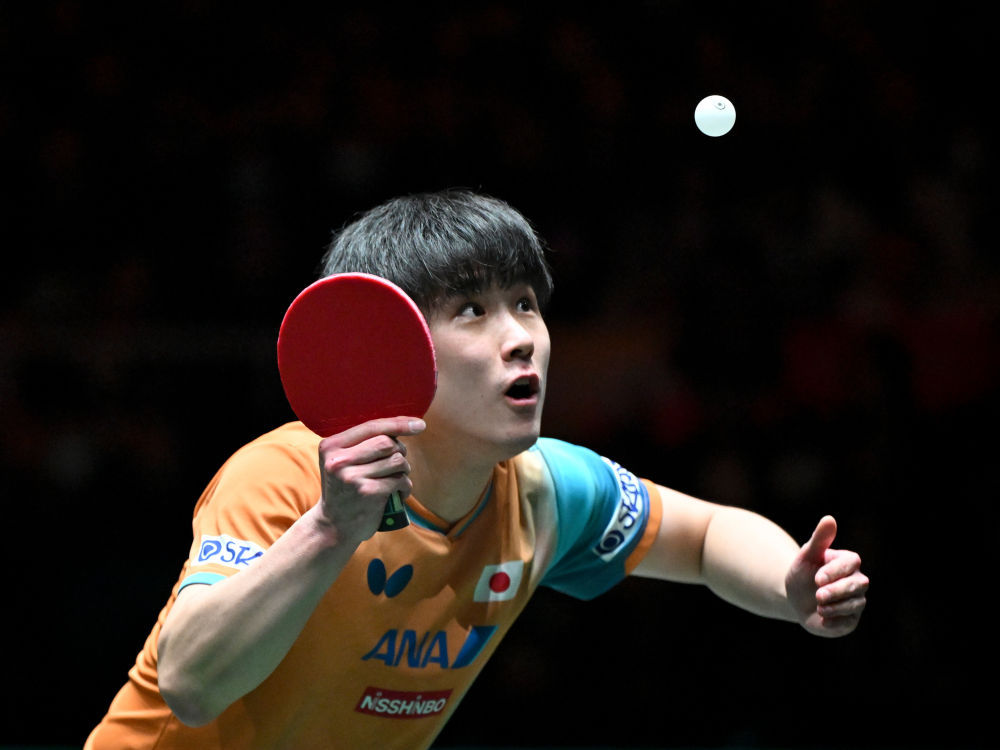 ↑ 日本队选手张本智和在男单比赛中回球。他1比2不敌中国队选手林诗栋。 新华社记者 胥冰洁 摄
