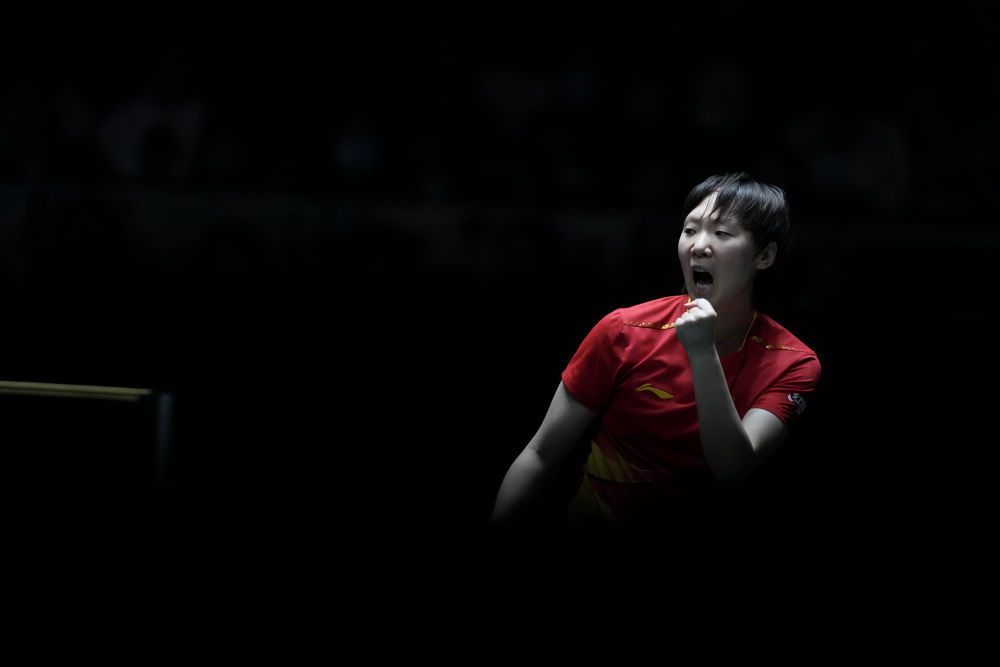 ↑ 中國隊選手王曼昱在女單比賽中慶祝。她3比0戰勝日本隊選手張本美和。 新华社记者 王迎 摄