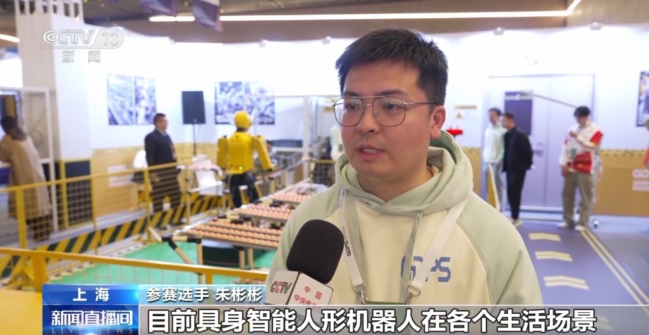 参赛选手 朱彬彬:双臂负载能达到三十公斤,充电一小时,可以持续干活八小时。通过这个比赛,可以给大众展示目前具身智能人形机器人在各个生活、工业场景的落地情况。