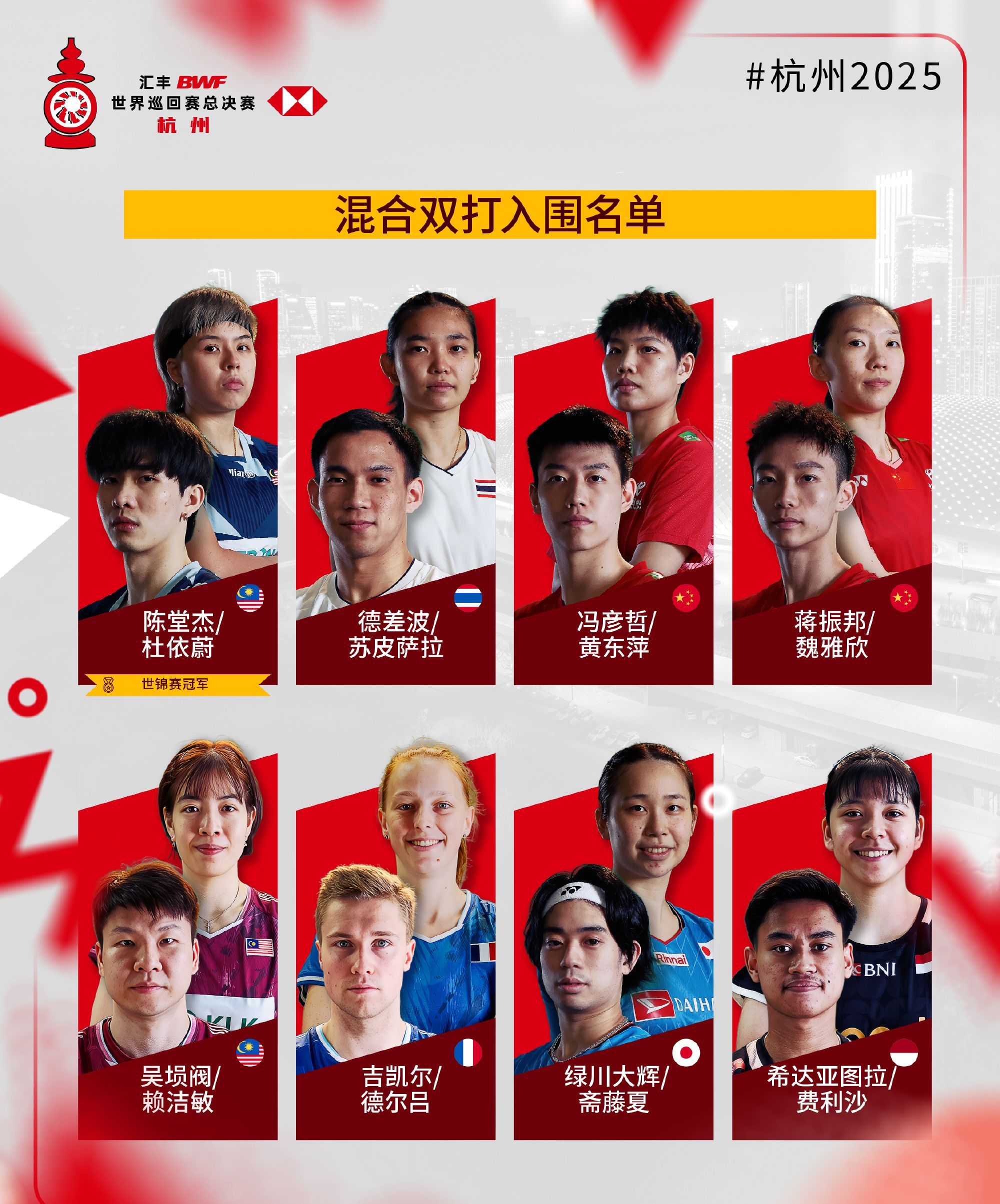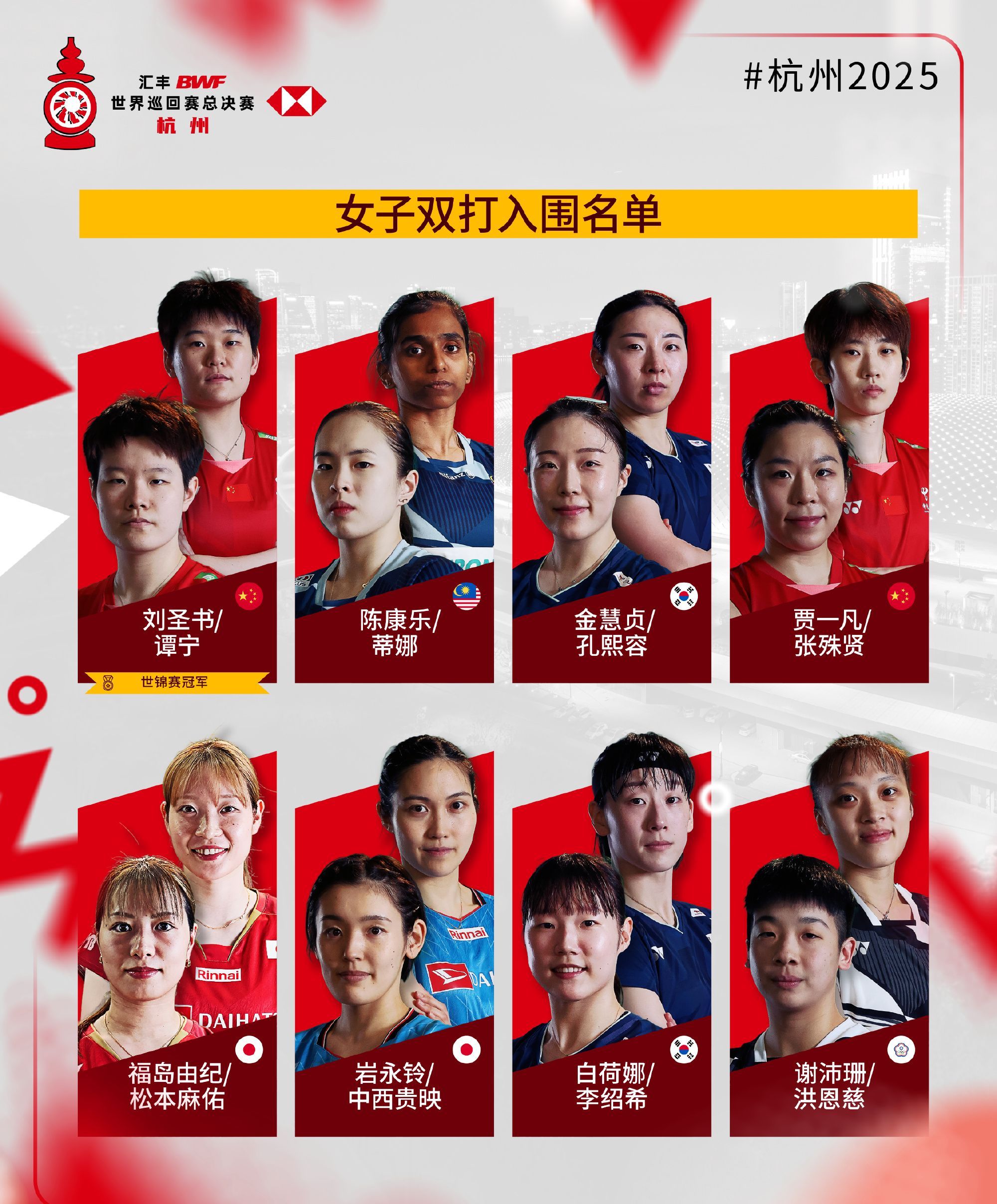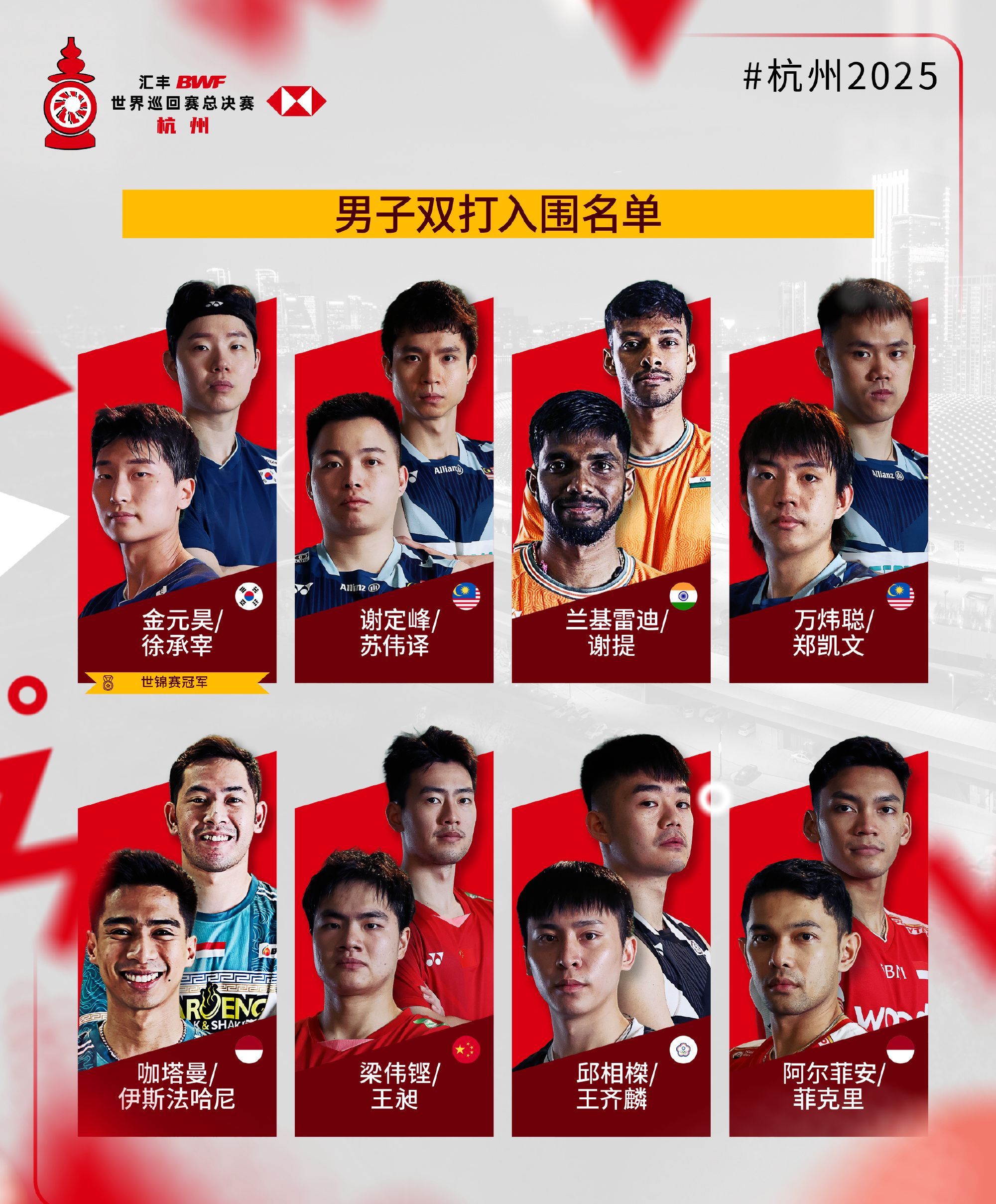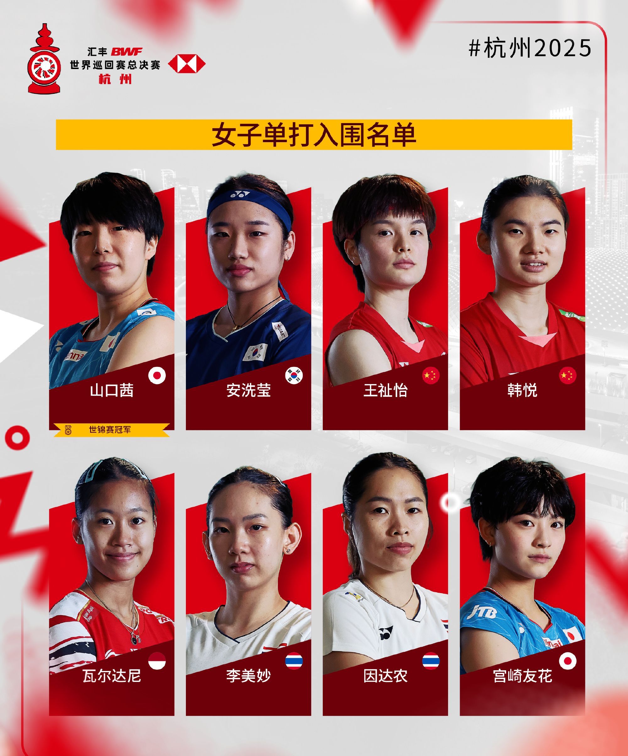 簡介2025年世界羽聯年終總決賽入圍名單公布,比賽將于2025年12月17日至21日在杭州舉行。各單項世錦賽冠軍自動獲得參賽資格。 ...