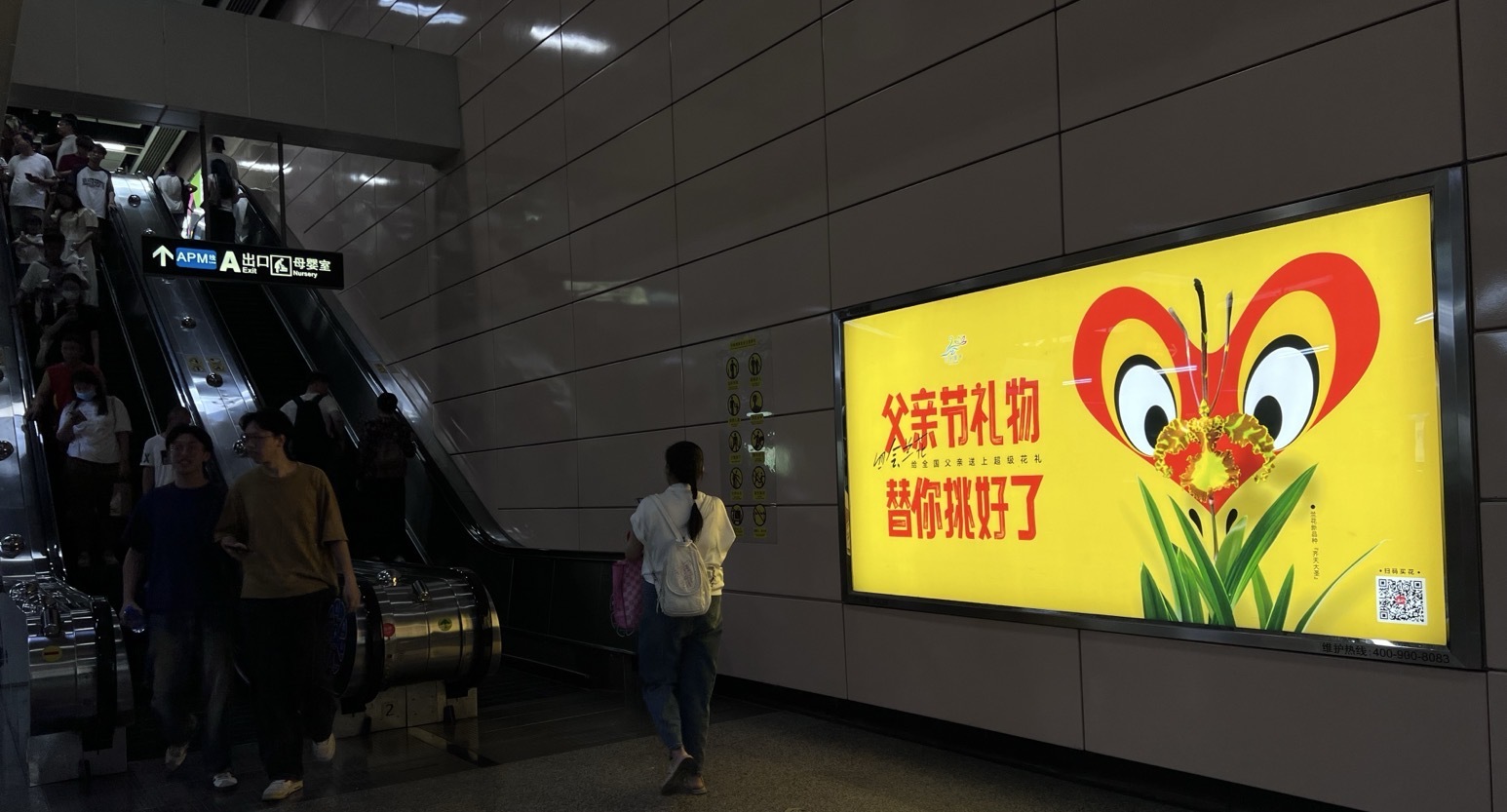 作为大湾区核心地标的重要交通枢纽,广州塔地铁站是广州地铁3号线和APM线的换乘站,在刚过去的端午假期中日均出站客流达7.7万人次。地铁空间作为城市生活的重要场景,具有“高频触达+即时转化”的天然优势。乘客在通勤途中即可扫码获取产品信息,实现从“品牌认知”到“消费决策”的快速衔接。此次“四会兰花 给全国父亲送上超级花礼”的广告投放,依托广州塔地铁站地理优势辐射高端商务人群、家庭客群与旅游客群,明快亮眼的设计风格吸引视觉焦点,通过“父亲节礼物”的场景化设计,精准切入消费者情感需求,将花卉从日常消费品升级为情感载体,为“父爱如兰”理念及父亲节礼品市场注入新活力。