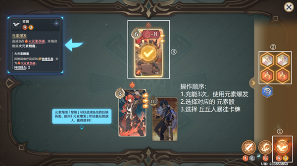 選擇四個火元素骰子,打出元素爆發(fā),去擊殺丘丘人暴徒。