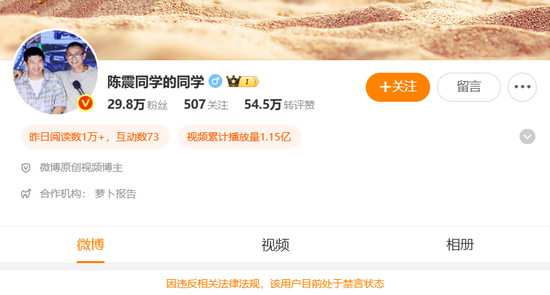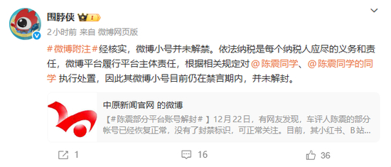 12月22日,@围脖侠发文回应“陈震部分平台账号解封”:经核实,封平微博小号并未解禁。陈震依法纳税是账号每个纳税人应尽的义务和责任,微博平台履行平台主体责任,已解根据相关规定对@陈震同学、@陈震同学的同学 执行处置,因此其微博小号目前仍在禁言期内,并未解封。