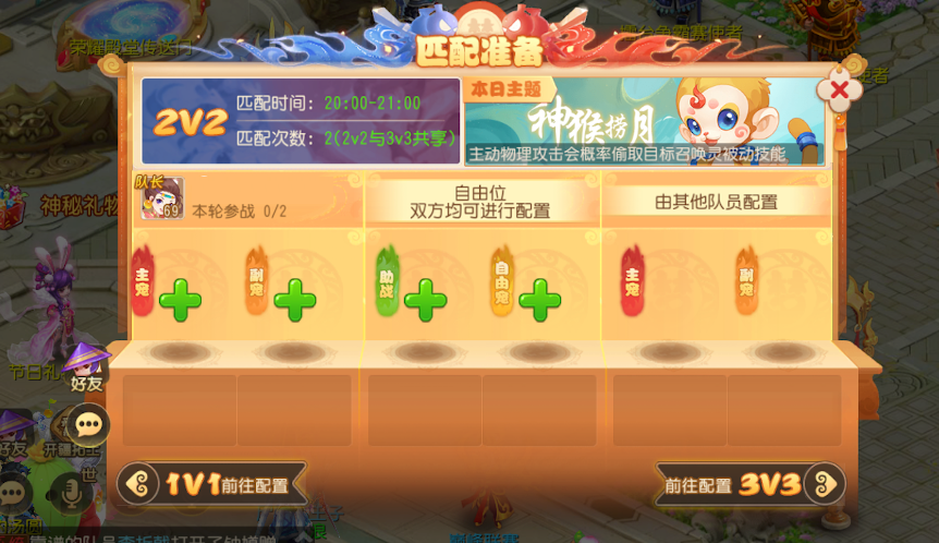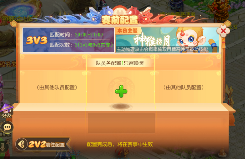 每日最多参赛2场,少侠可在金兰备战岛与其他队员自由组成2人队伍或3人队伍参与匹配。其中,2人队采用2v2规则,初始共携带5只召唤灵和1个助战。