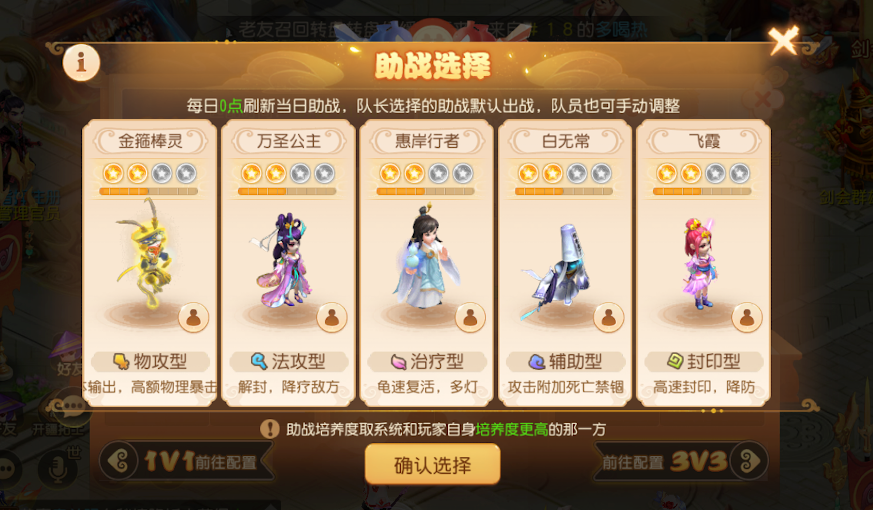 2.队伍成员可以在系统提供的5个助战中选择1个加入战斗。