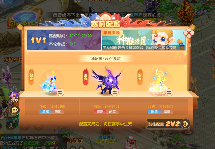 每日最多参赛3场,采用召唤灵擂台对战规则,初始携带3只召唤灵出战;获胜可获9分个人积分,失败获1分个人积分,个人积分每日重置。