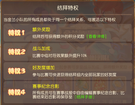当金兰小队所有成员处于同一结拜关系时,可激活以下特权: