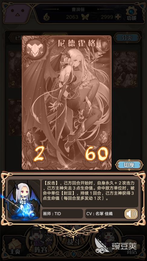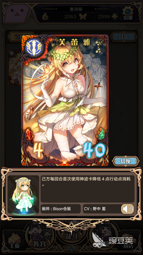2、角色分析:芙雷雅是个中规中矩的辅助类附加之神,没有特别的优势。但是在被控制的情况下,芙雷雅依然能触发技能,这是别的角色卡所没有的能力。