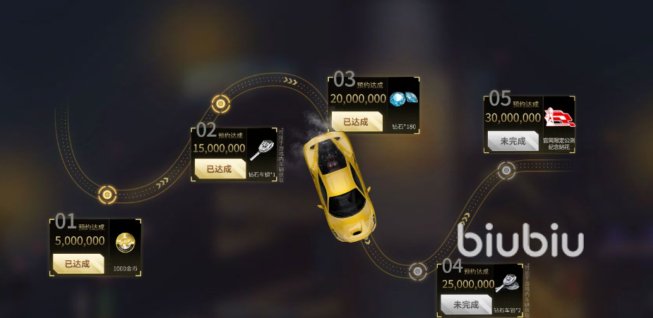 当预约人数达到500万的时候可以得到1000金币,金币是这个游戏的里普通货币,可以购买许多车辆相关的配件、贴图等等;达到1500万人次获得额外1把车钥;达到2000万人次可以得到180钻,钻石的购买力熟悉手游的玩家不可能不知道;达到2500万解锁额外2把车钥;达到3000万解锁官方限定纪念贴花。