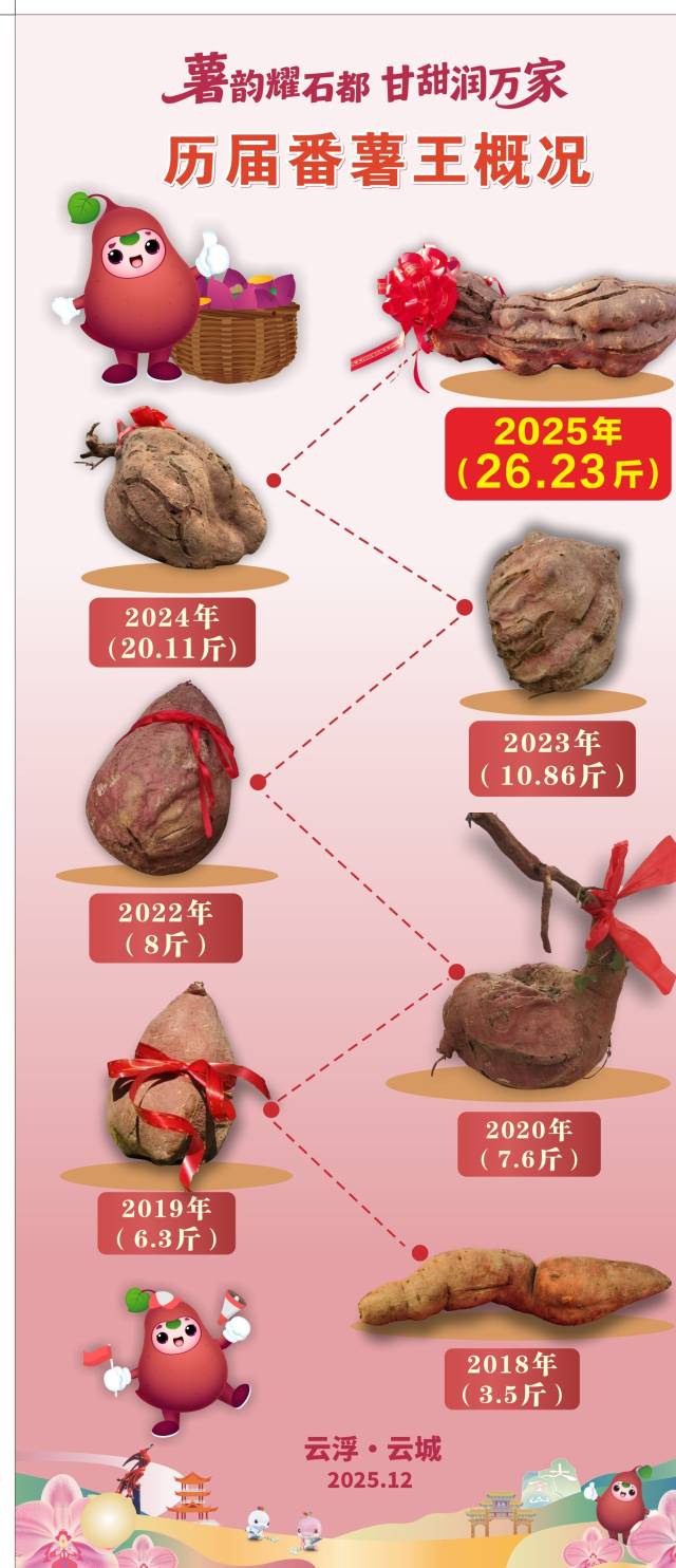 “26.23斤!今年的斤年‘番薯王’正式出炉。”12月5日,云城在云浮市云城区深入实施“百千万工程”三年初见成效暨第八届乡村美食(番薯)旅游季开幕式,亮相来自前锋镇横山村委选送的番薯王西瓜红番薯荣获“特别大奖”。