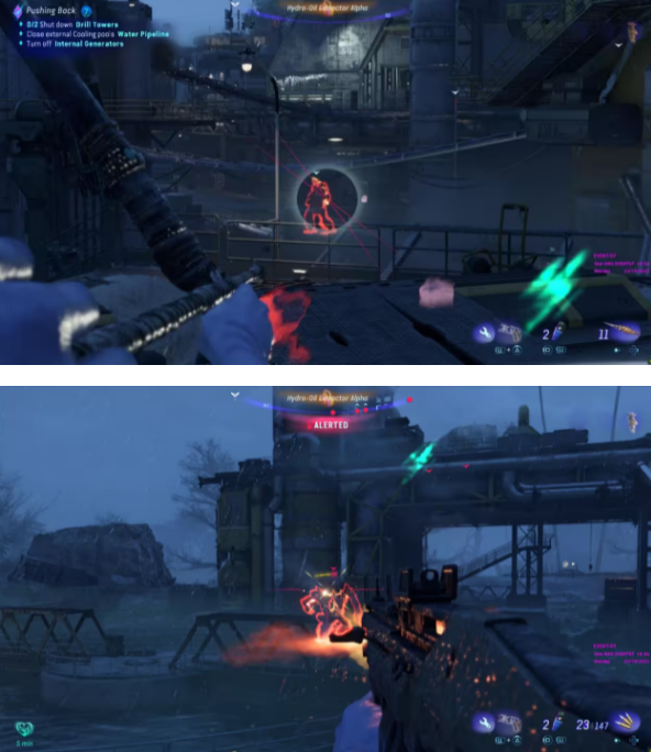启用“纳威感应”(类似“刺客信条”系列中的鹰眼)能够发现敌人的弱点,像是人类护甲薄弱的部分和机甲的驾驶员等等,配合技能树加点,遇到较难对付的机甲类敌人时可以徒手拽出其中的驾驶员——与人类相比,纳威人身高与力量上的优势在战斗中可以带来强烈的压迫感。与此同时,场地上还设置了爆炸油桶之类的陷阱,玩家可以在引诱一群敌人追击自己,再利用陷阱同时解决它们。