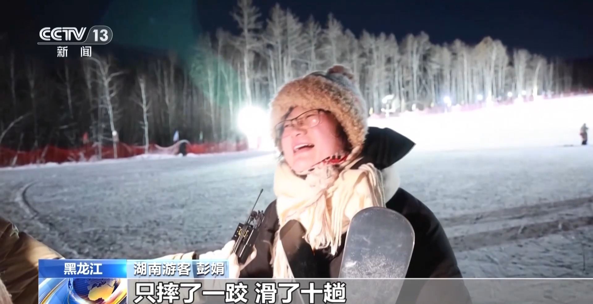 湖南游客 彭娟:过瘾!我一开始还不太会滑,来这边初级滑雪场滑得很开心,只摔了一跤,滑了十趟。
