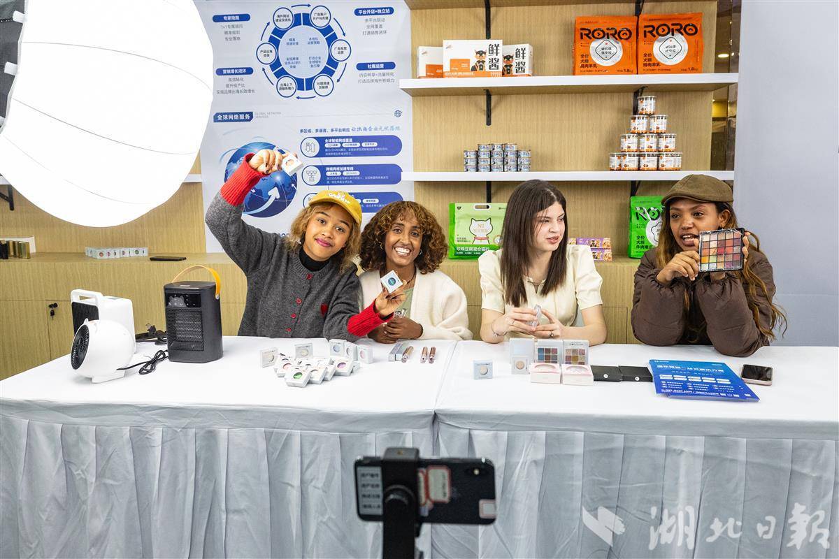 图为跨境电商展区,不少海外主播在直播镜头前展示着特色产品。