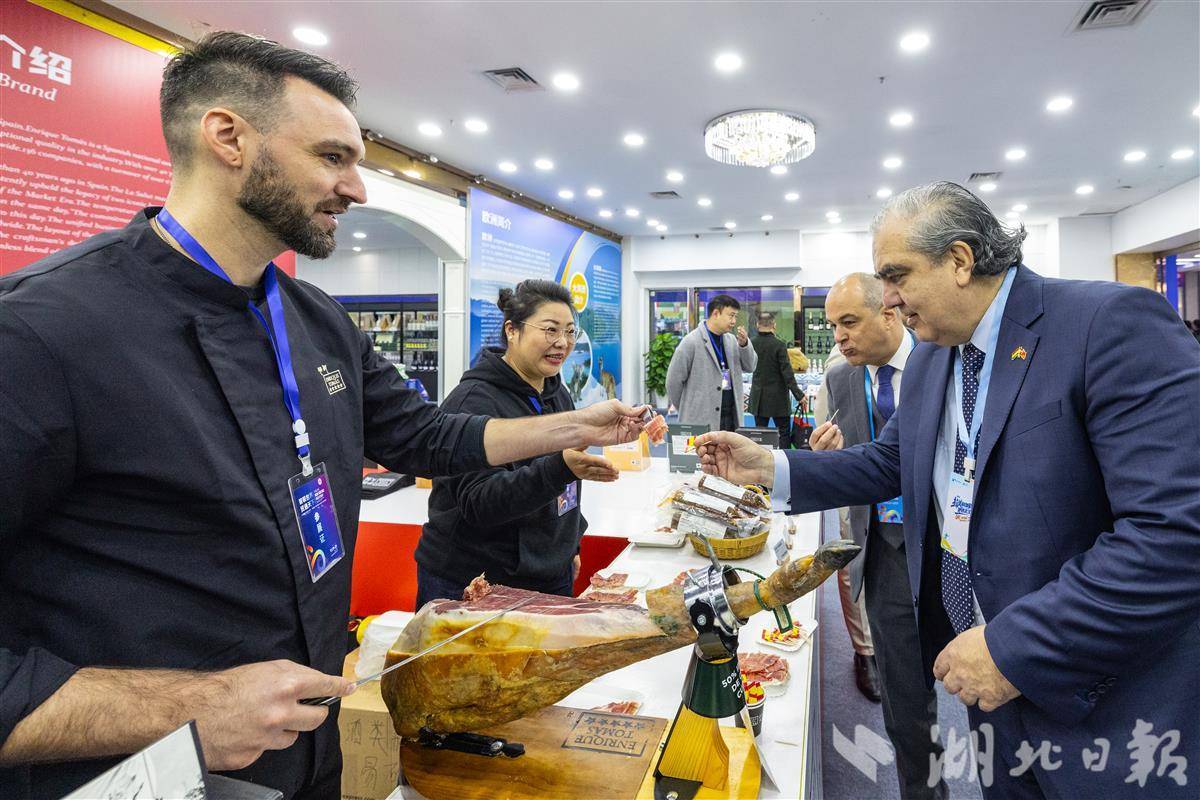 图为外国嘉宾品尝西班牙进口依挑火腿。