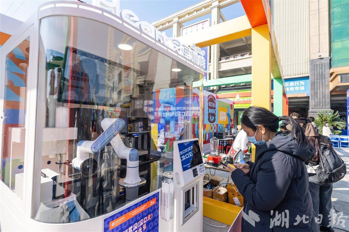图为在咖啡茶饮展区,参观者体验机器人制作咖啡。