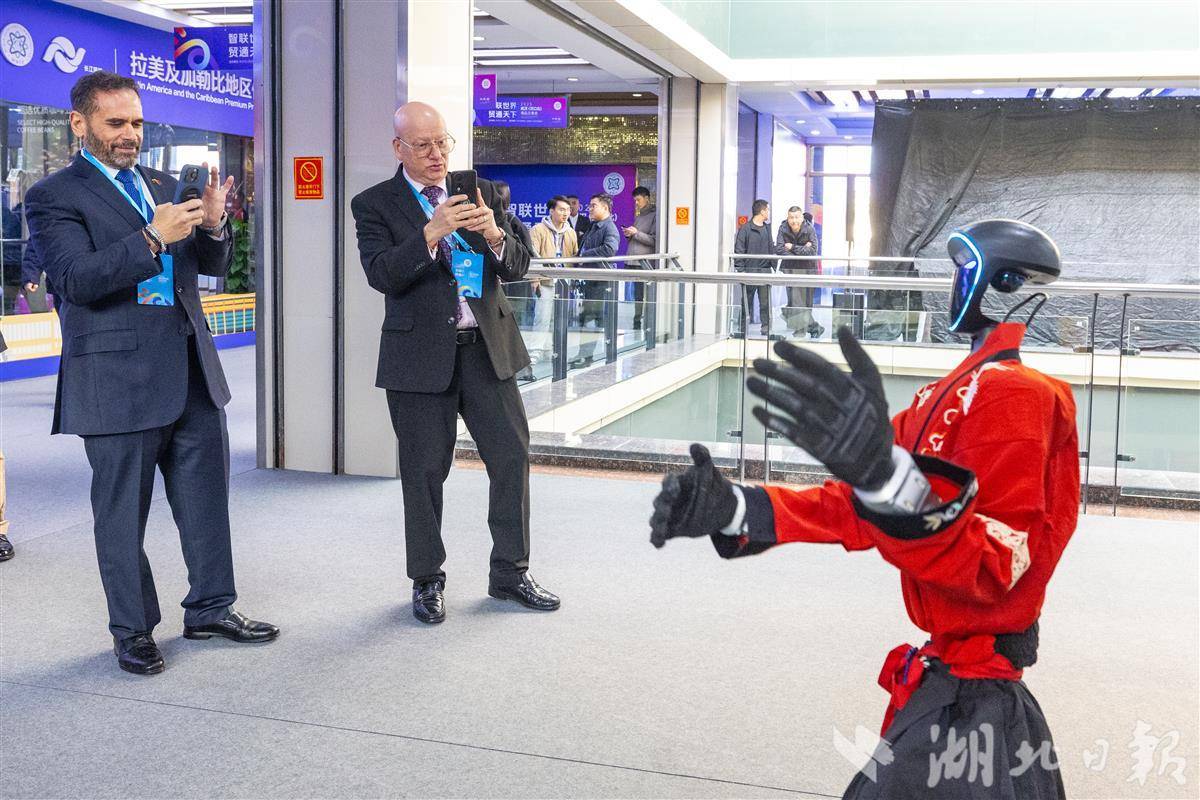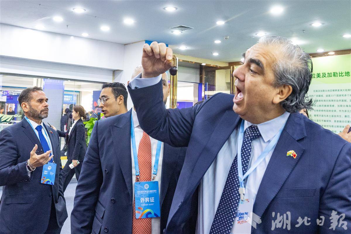 图为在主展区,外国嘉宾现场参观,此次汉交会来自欧洲、亚洲、拉丁美洲、非洲等地区的食品饮料、工艺品、高端消费品等备受关注。