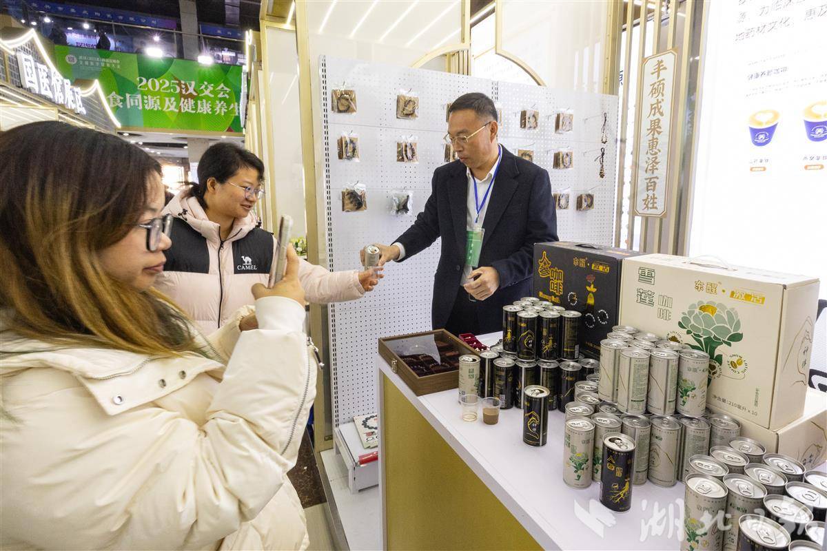 图为在药食同源展区,参观者现场品尝人参咖啡。