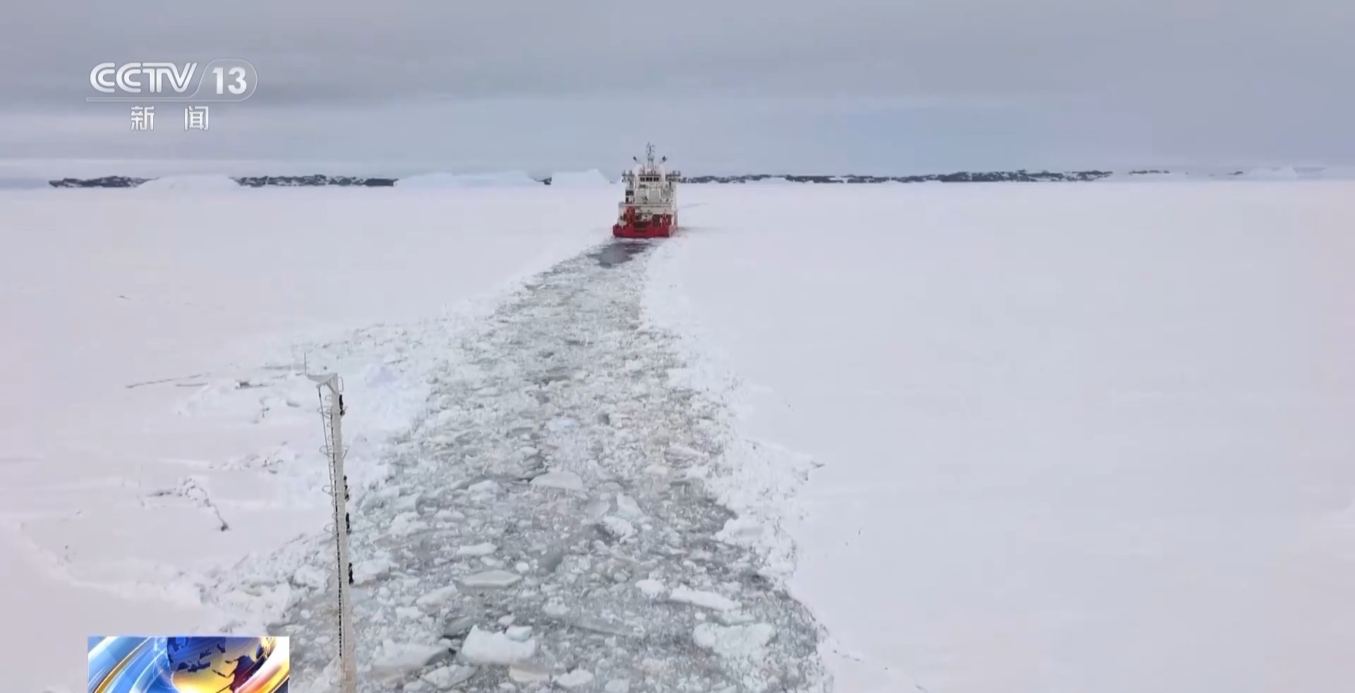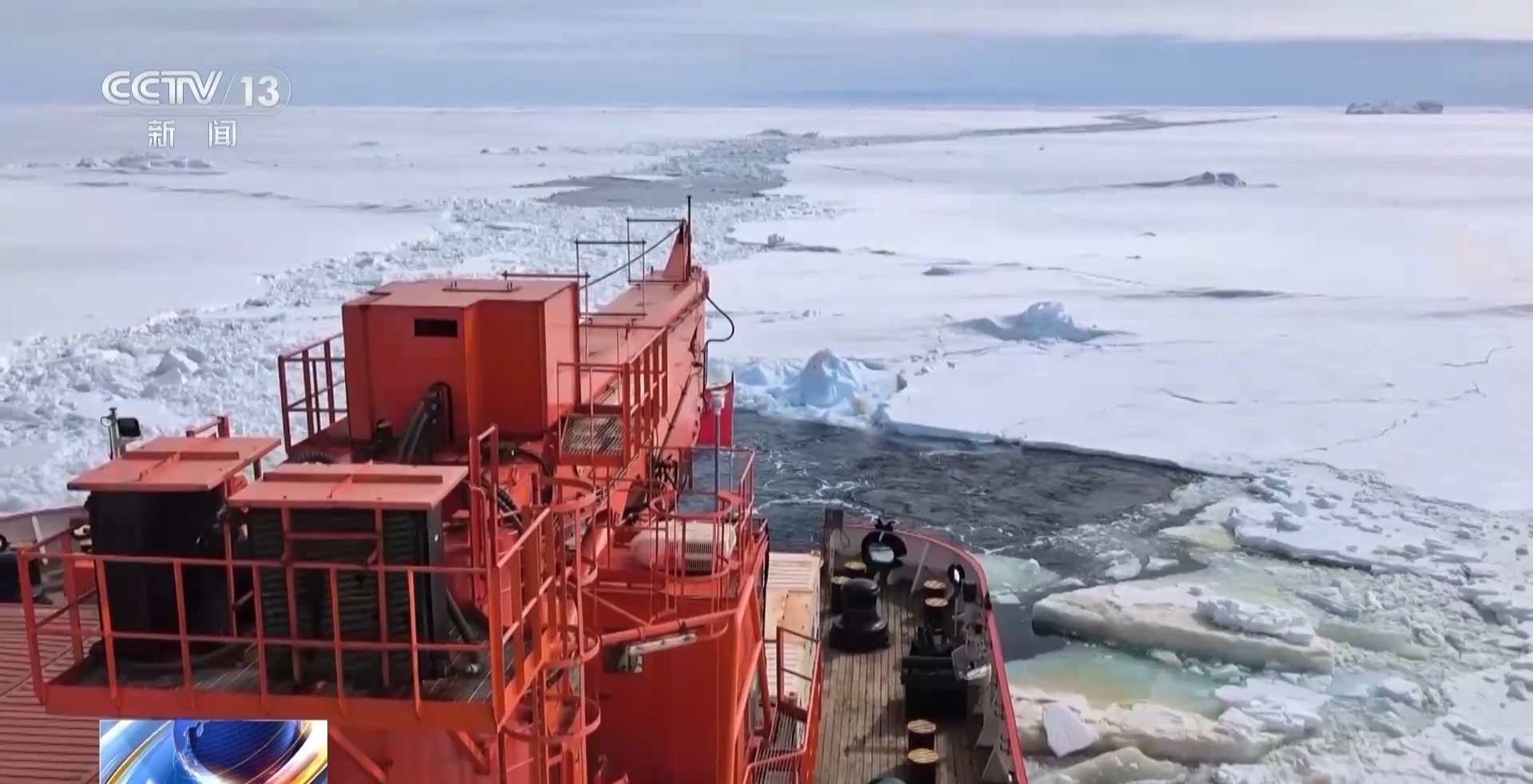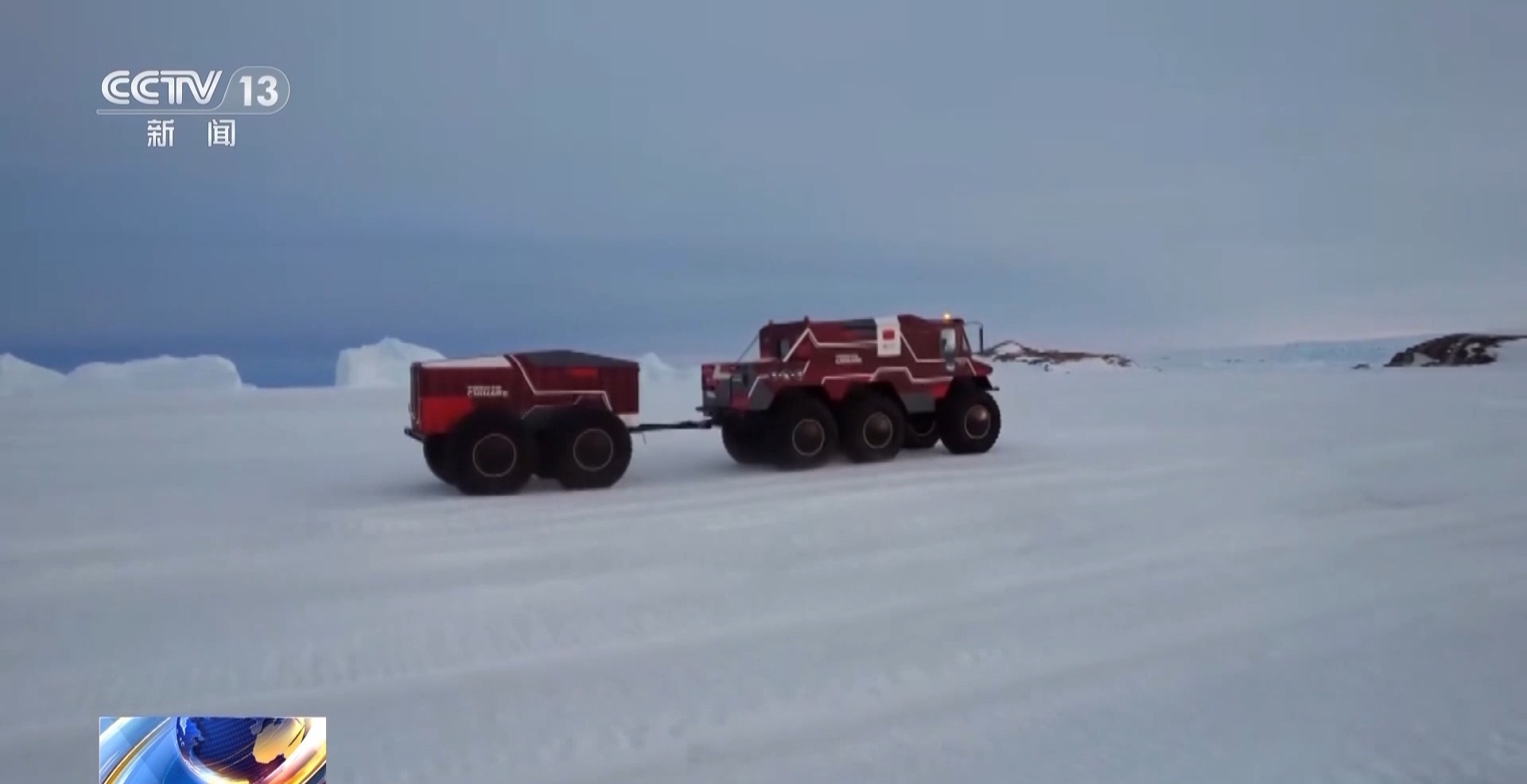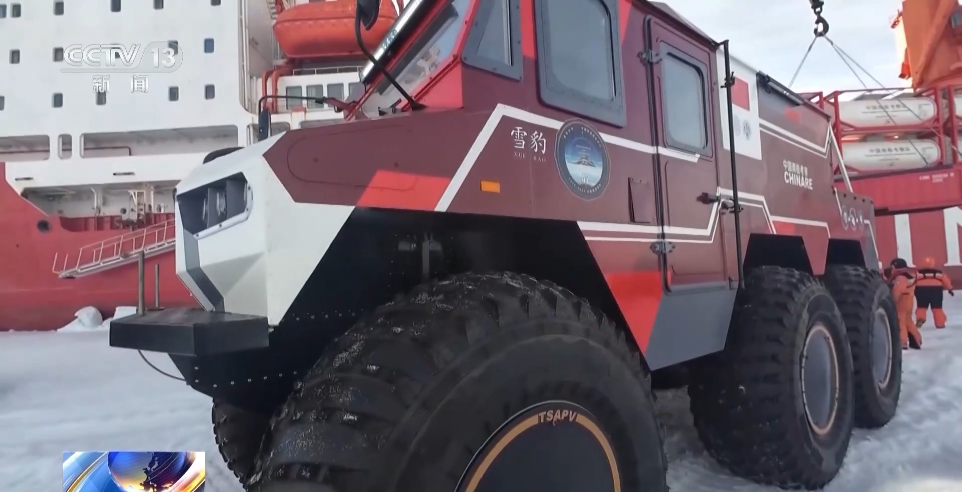 总台央视记者 王善涛:在我旁边的大家伙,就是雪豹6×6轮式载具,它在“雪龙”号抵达卸货作业点的第一天就被卸载到冰面上。现在因为有了海冰卸货,它可以靠人员驾驶的方式驶离这片海冰,驶向南极大陆。