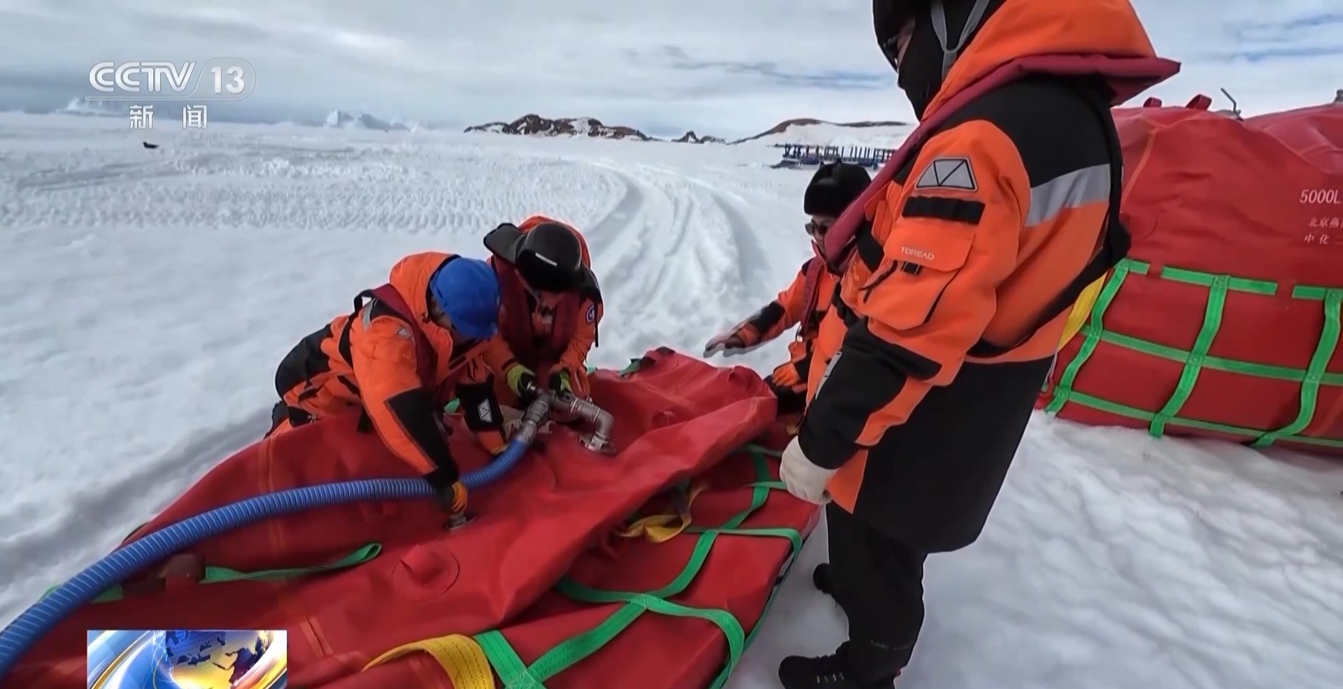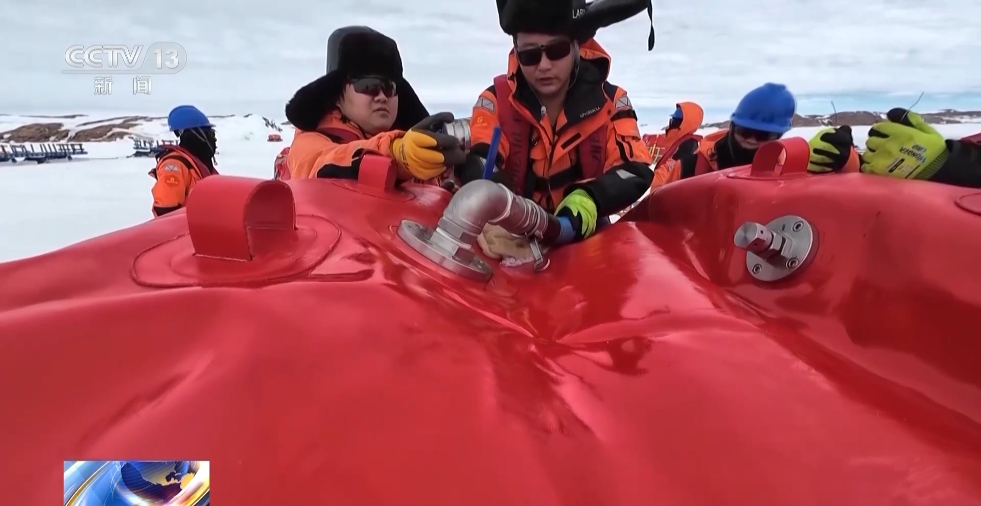 队员们先给两个油囊加注燃油,没多久,油囊里就传来嘟嘟的响声。从船上的油舱到海冰上的油囊,作为考察队重要保障物资的燃油,开始流动了起来。