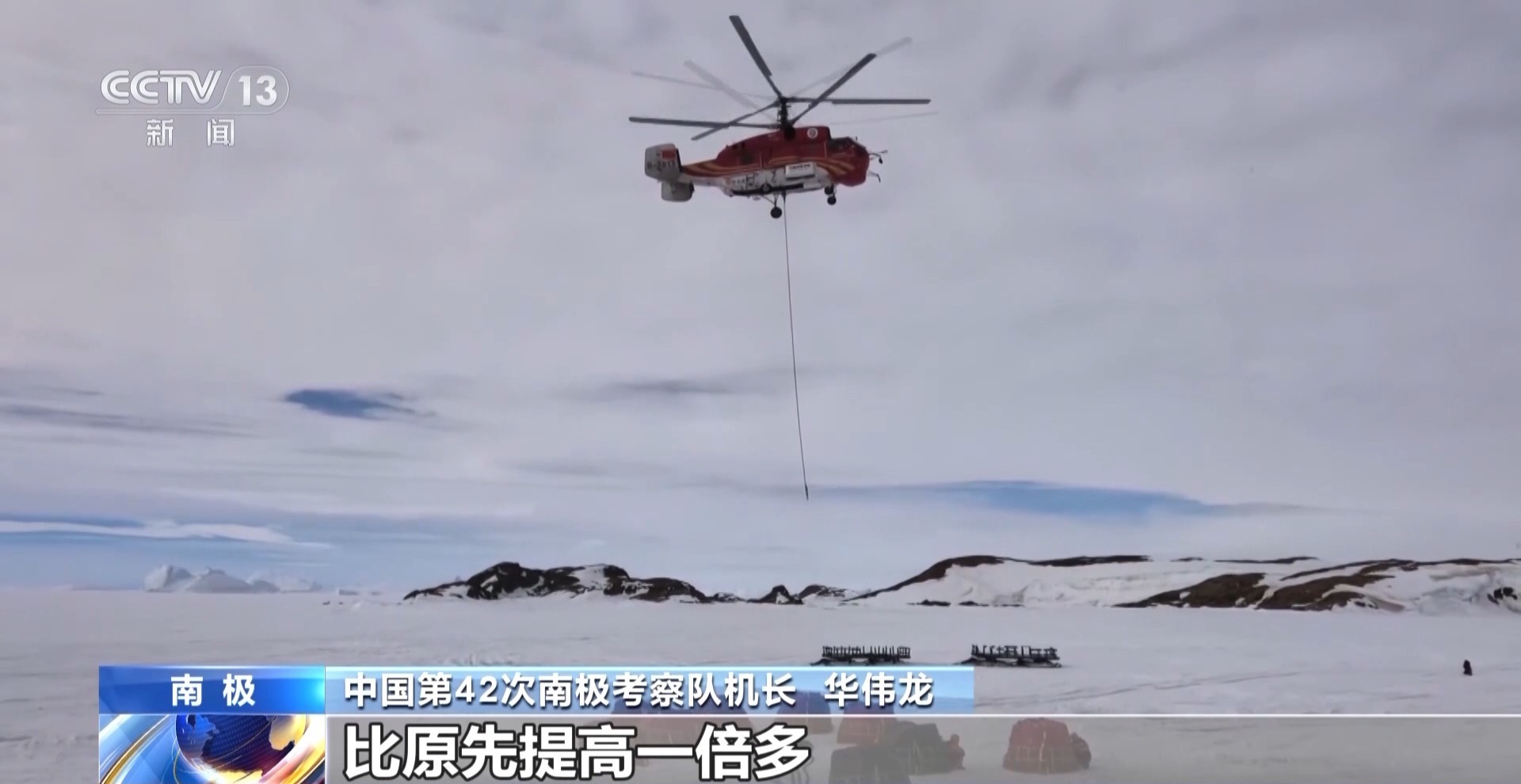 中国第42次南极考察机长 华伟龙:现在两船距离中山站的直线距离是10公里左右,效率就会提高许多,比原先提高一倍多。原来加一次油,飞中山站也就是4吊到5吊,现在一个架次可以10吊左右。