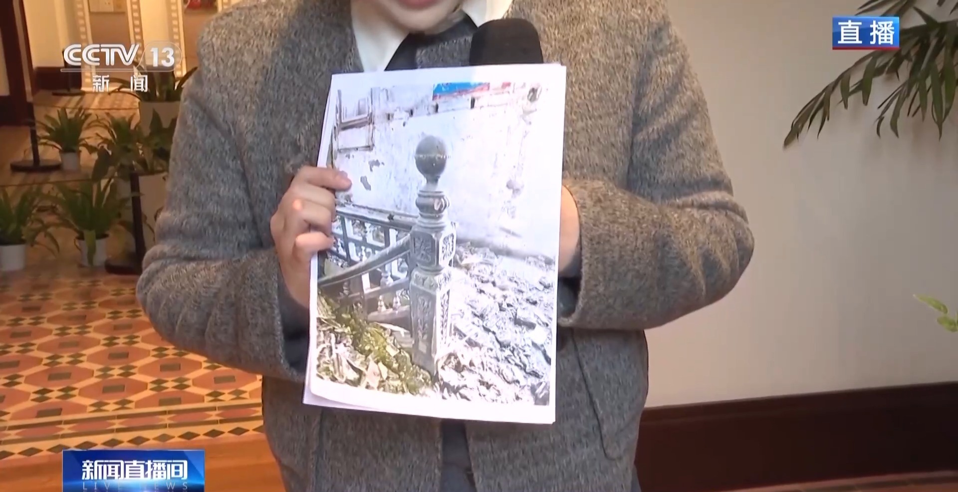 记者手里拿的是建筑修缮前的现场照片。照片里记录了曾经的楼梯一截,通过历史照片的比对,工人一比一还原了最初的楼梯模样。
