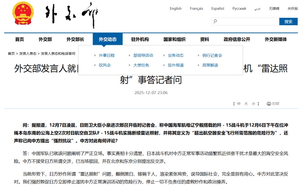 外交部发言人就日方声称中国海军舰载机对日本自卫队战斗机“雷达照射”事答记者问