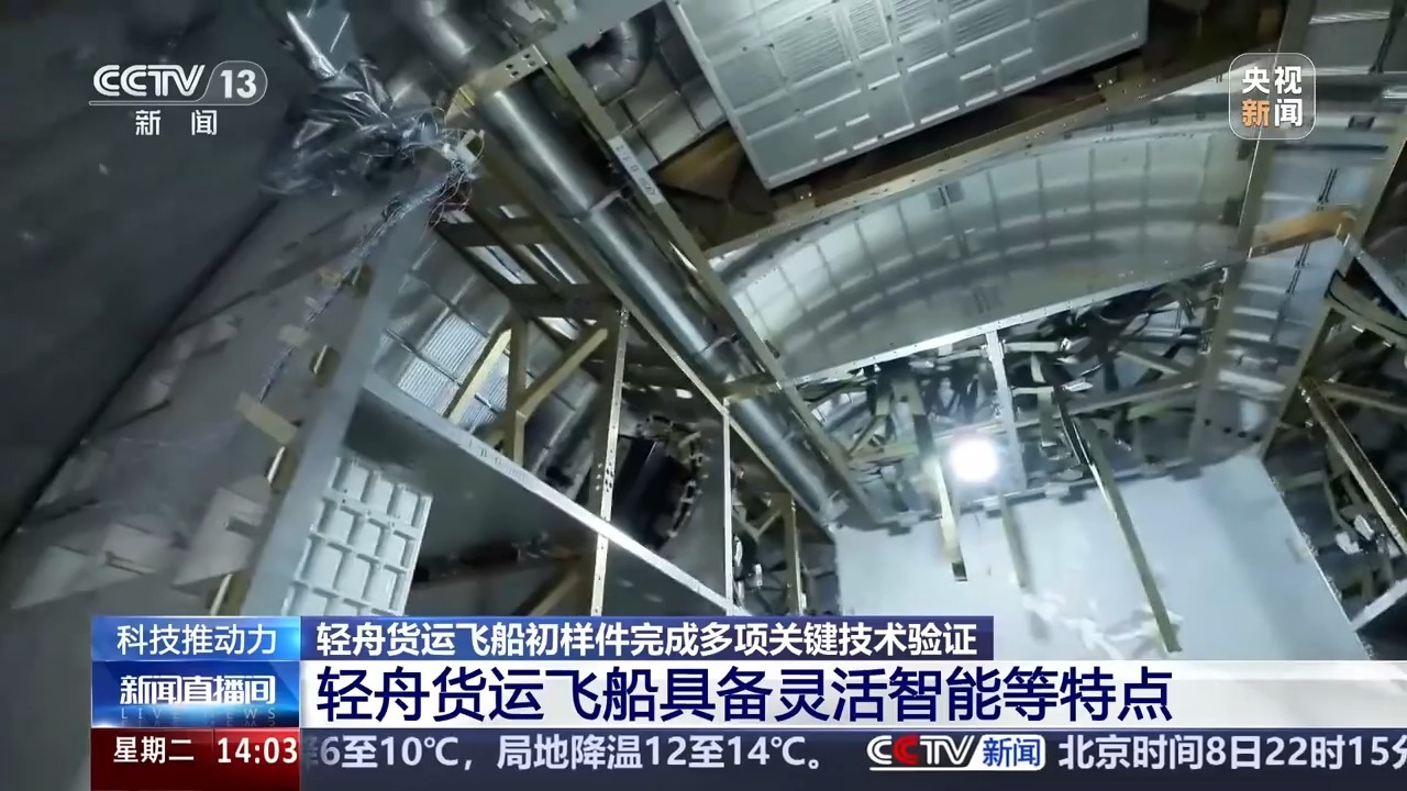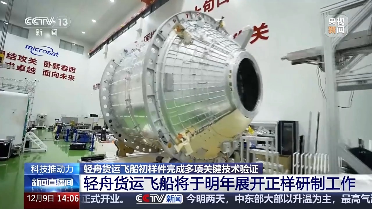 总台央视记者 帅俊全:在我身旁就是保多项轻舟货运飞船的初样件,它的鲜冰箱轻直径3.3米左右,重量是舟货5吨,上行货物的运飞样件验证能力达到1.8吨。可以看到轻舟货运飞船是由主体的密封舱和后段的非密封尾椎构成,这样可以在密封舱里搭载很多精密设备仪器以及生活需要物资,而在开放的尾椎上能搭载很多其他的载荷以及需要进行空间暴露实验的设备,从而使整个货运飞船的运载能力达到最佳。