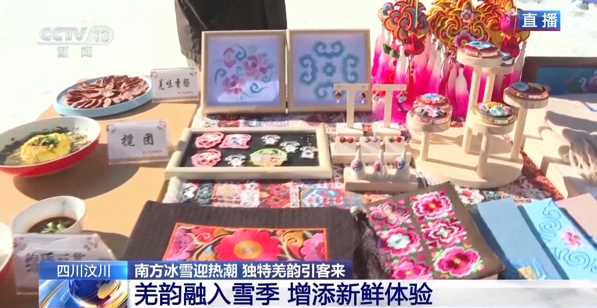 如果游客玩累了,还可以在雪场里品尝绵虒豆花这些当地特色小吃,选购非遗羌绣或是有羌族特色的文创产品。