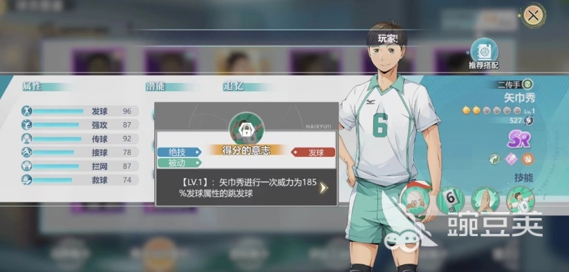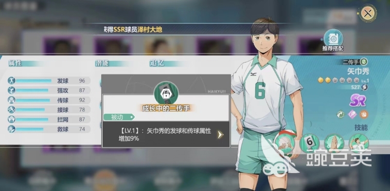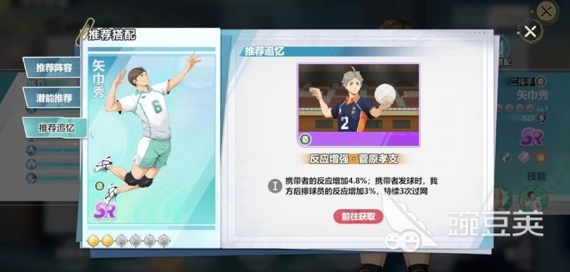 跳发球只要对面没有有利的接球技能,大家这个得分就拿定了,虽然没有羁绊效果,但是推荐大家使用的阵容是岩泉一、松川一静、花卷贵大这样的搭配,因为潜能是传球发球,所以套装要么选择精准发球,要么就选择精准传球,最后的追忆选择反应增强管原孝支的追忆就可以了。
