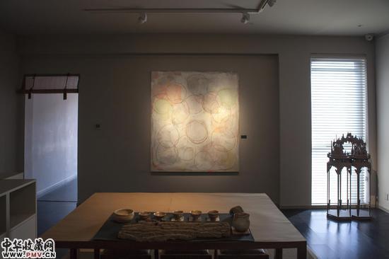 展览现场 如果穆勒从20世纪中期开始发展一种绘画方式:即不通过把不同成分、大小和颜色的布料改变成单纯地通过增添过程来创作艺术作品,这一定会被认为参照了极简主义艺术。“事实上,他的作品一次又一次地让我们瞥见对绘画传统的隐喻,如硬边绘画艺术、色块画。。。。。。然而,这样的隐喻在穆勒的作品中相当散乱,并总是伴有某种转化;他们的实现方式通常相当粗糙、极度简化或是平庸到让观者觉得那可追溯的源头不过是自己直觉的共鸣罢了。参照物很模糊不清,几乎溶入穆勒自己的视觉世界:像一些没有占主导地位、却能引起共鸣的事物。回味可能会完全演变成别的东西。”误读和破裂往往标志着穆勒的作品,并暗示着失败的浪漫主义概念。