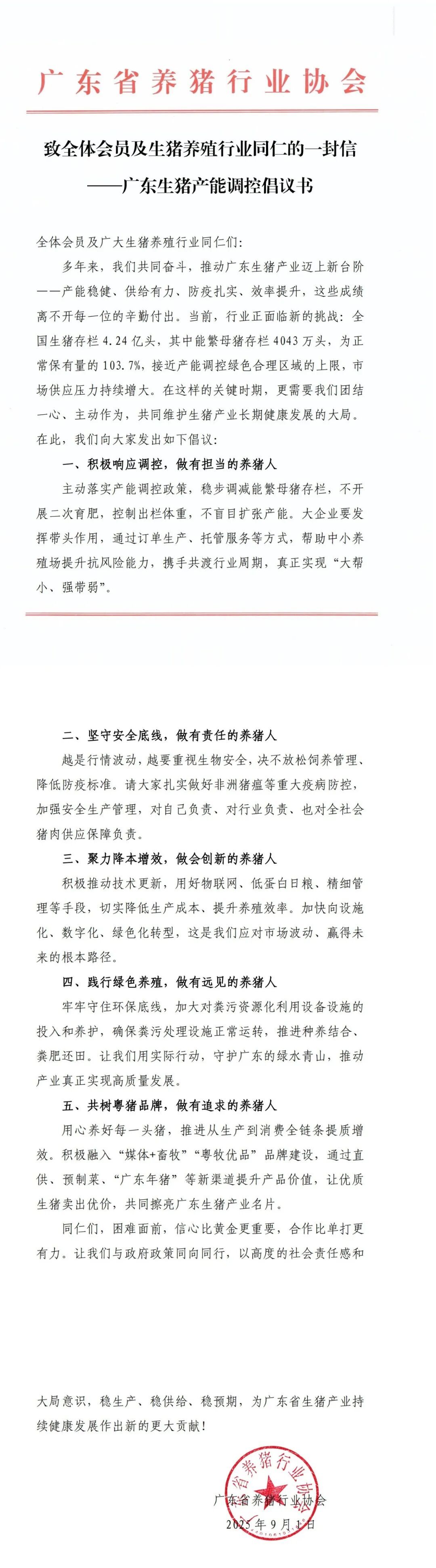 致全体会员及生猪养殖行业同仁的致全猪产一封信——广东生猪产能调控倡议书_南方+_南方plus9月1日,广东省养猪行业协会向全体会员及生猪养殖行业同仁发布《致全体会员及生猪养殖行业同仁的封东生一封信——广东生猪产能调控倡议书》,呼吁行业主动调减产能应对生猪供应过剩压力,控倡共同维护产业长期健康发展。致全猪产