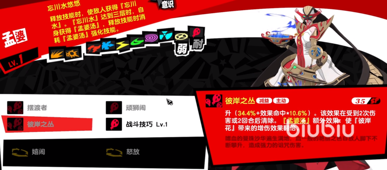 彼岸之丛:主动减益技能,消耗35SP。对所有敌人造成50%攻击力的诅咒属性伤害,并且使所有敌人获得彼岸花的效果,受到的伤害提升34.4%以及弱点命中加10.6%。这一个效果会在对方受到两次伤害你或者两个回合之后清除,使用孟婆汤额外效果会让彼岸花的增益翻倍。
