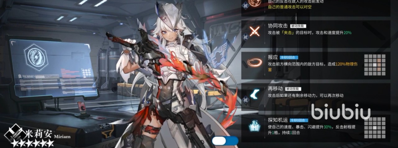 第一位推荐特勤是境界角色角色米莉安,这个特勤的线星职业是突击,攻击强度比较高,血也是比较厚的,她的技能一共有五个,基本上都是被动技能,唯二的一个主动技能是【探知机运】,一共可以使用三次,且不会有冷却时间,在释放完这一技能后,米莉安的速度、暴击、闪避等属性都能有所提升,还有反击射程都会有所增加,另外一个【报应】能够横向范围地攻击前方敌人,对他们造成120%的物理伤害,如果敌方的物理防御比较弱的话,基本上这一招能直接秒杀,剩下的技能是先兆预知、报应、协同攻击以及再移动,它们的效果就是用来提升米莉安所具备的一些属性的,或者是增加她的再移动次数。