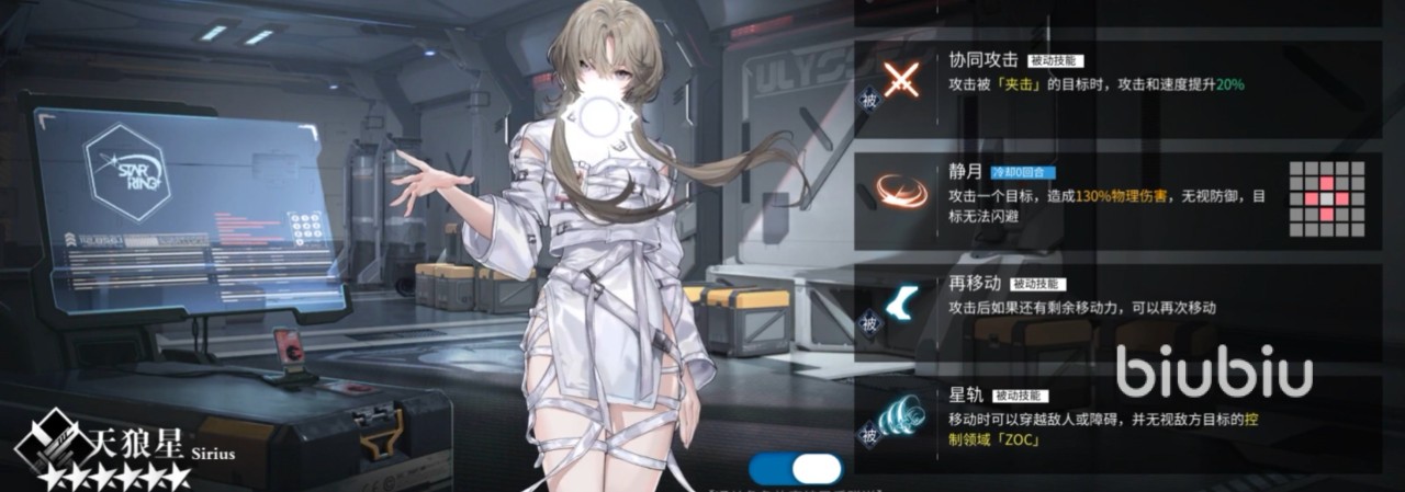 第二位推荐是天狼星,她的主动技能是【静月】,释放之后,可以无视敌方身上的防御,直接对其造成130%的物理伤害,同时敌方无法闪避这一伤害,真的很厉害的一招,命中率极其的高,每一招都能打到对方的身上,其它的几个技能效果还蛮多样化的,【死星】在触发后,可以多次触发,并且能够让天狼星专注于攻击敌方生命低的目标,而【星轨】触发之后,能够让天狼星移动过程中直接无视敌方的控制领域,穿越那些障碍物。剩下两个技能的效果就比较普通,没用什么特别的。