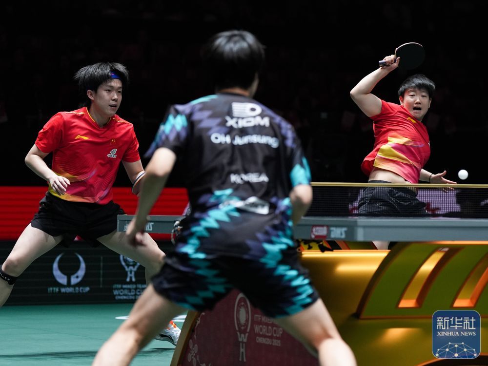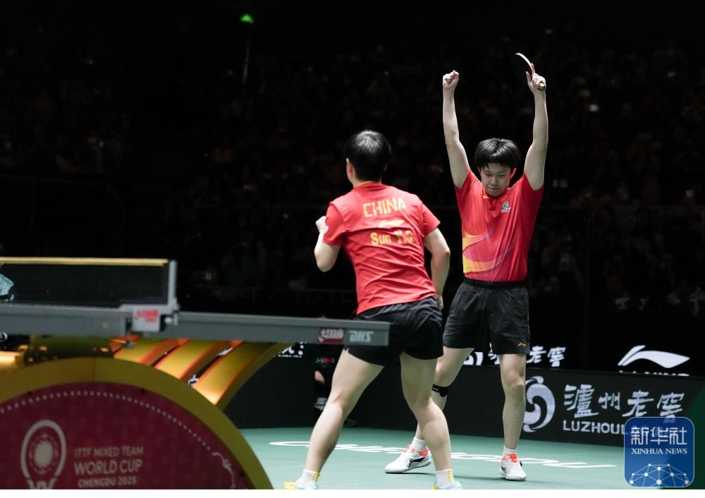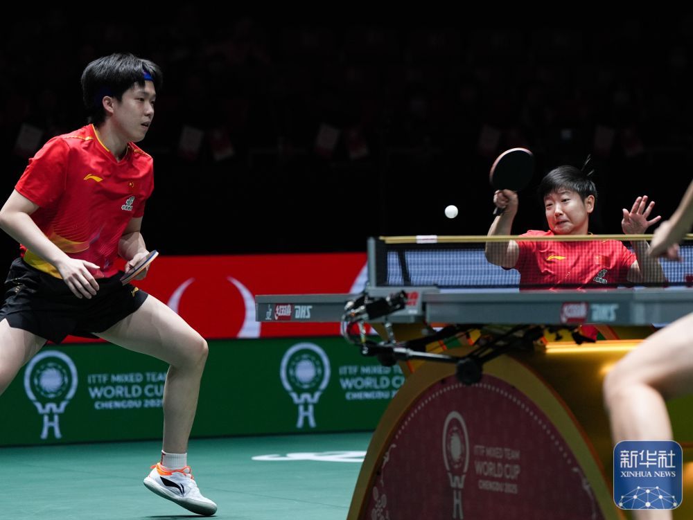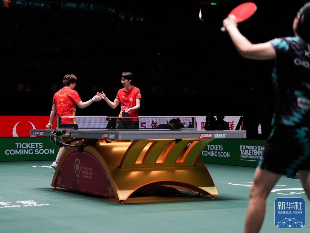 ↑ 中国队组合孙颖莎(右)/王楚钦在混双比赛中。界杯级决他们3比0战胜韩国队组合崔孝珠/吴晙诚。中国新华社记者 王迎 摄