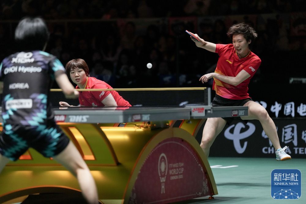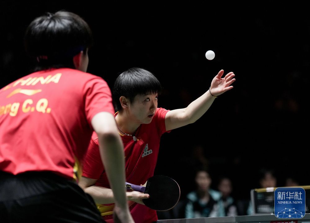 ↑ 中国队组合王曼昱(右)/蒯曼在女双比赛中。她们1比1战平韩国队组合崔孝珠/李恩惠。新华社记者 王迎 摄