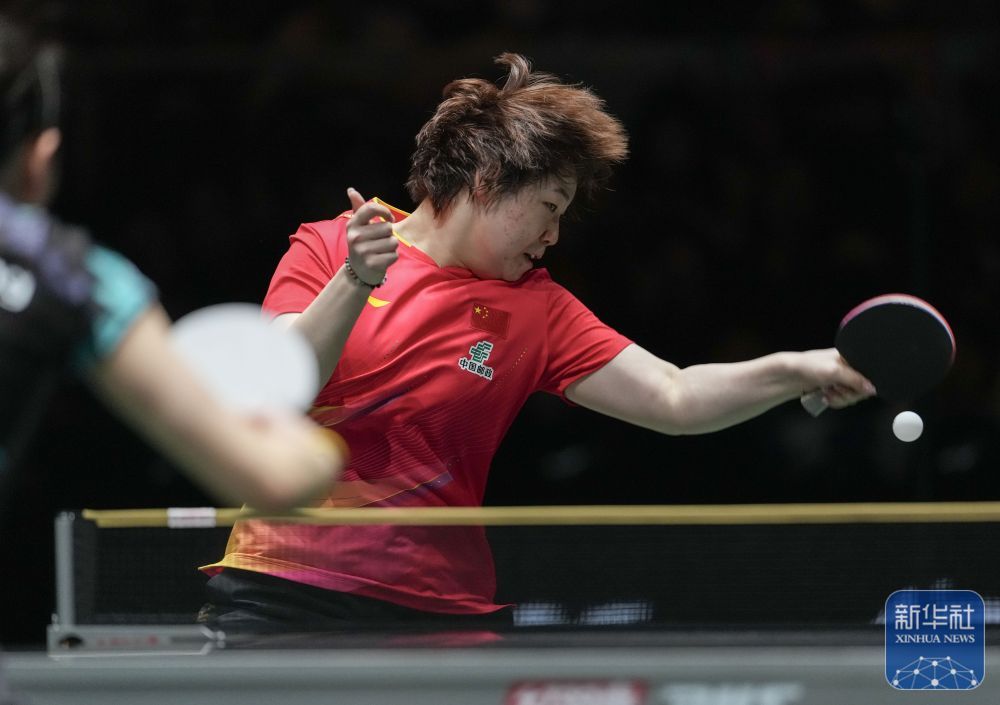 ↑ 中国队选手蒯曼在女单比赛中回球。中国她2比1战胜韩国队选手金娜英。队晋新华社记者 王迎 摄