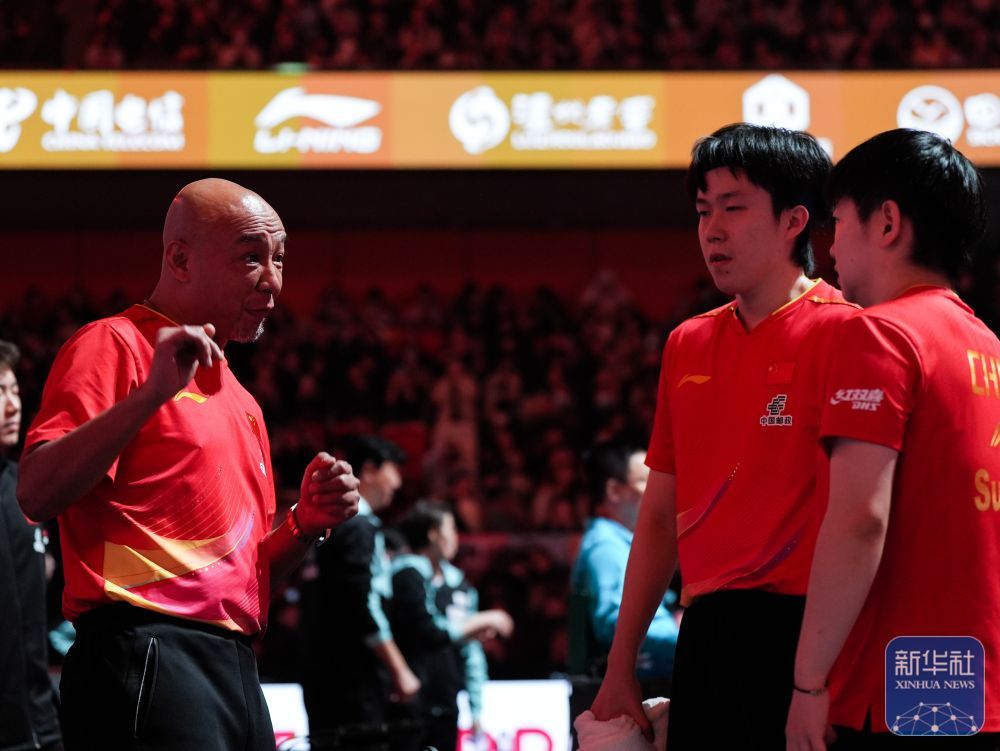 ↑ 中国队教练肖战(左)在比赛间隙指导孙颖莎(右)、王楚钦。新华社记者 王曦 摄