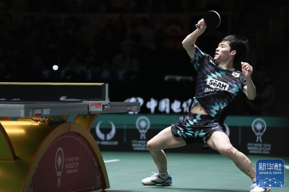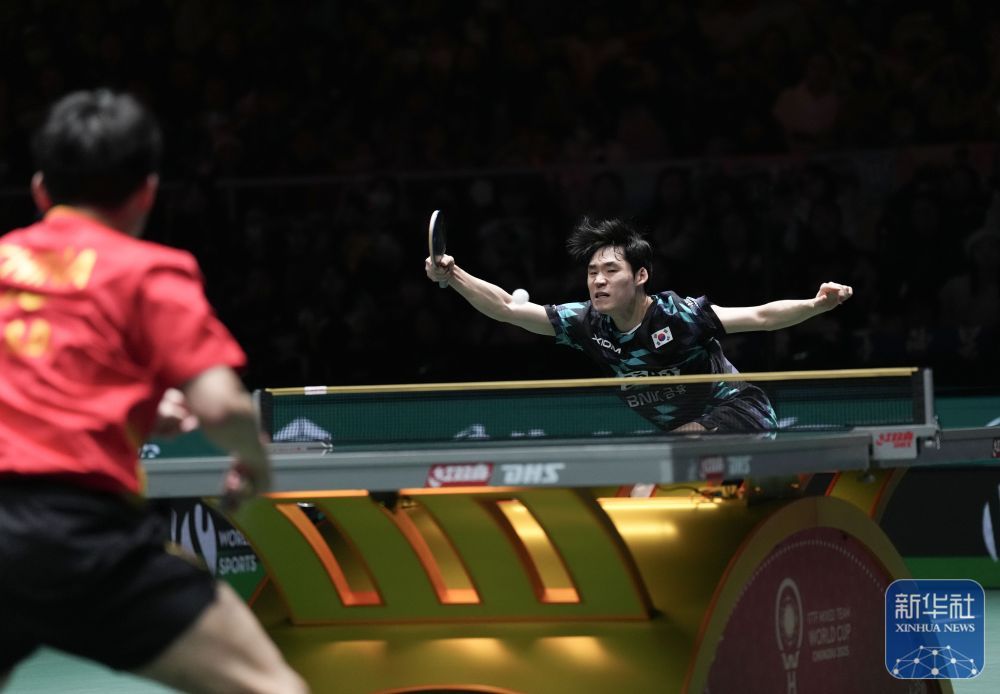 ↑ 韩国队选手张禹珍在男单比赛中回球。他1比2不敌中国队选手林诗栋。新华社记者 王迎 摄