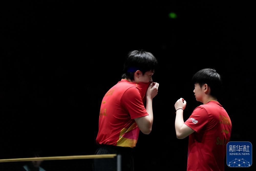 ↑ 中国队组合孙颖莎(右)/王楚钦在混双比赛中商量战术。他们3比0战胜韩国队组合崔孝珠/吴晙诚。新华社记者 王迎 摄