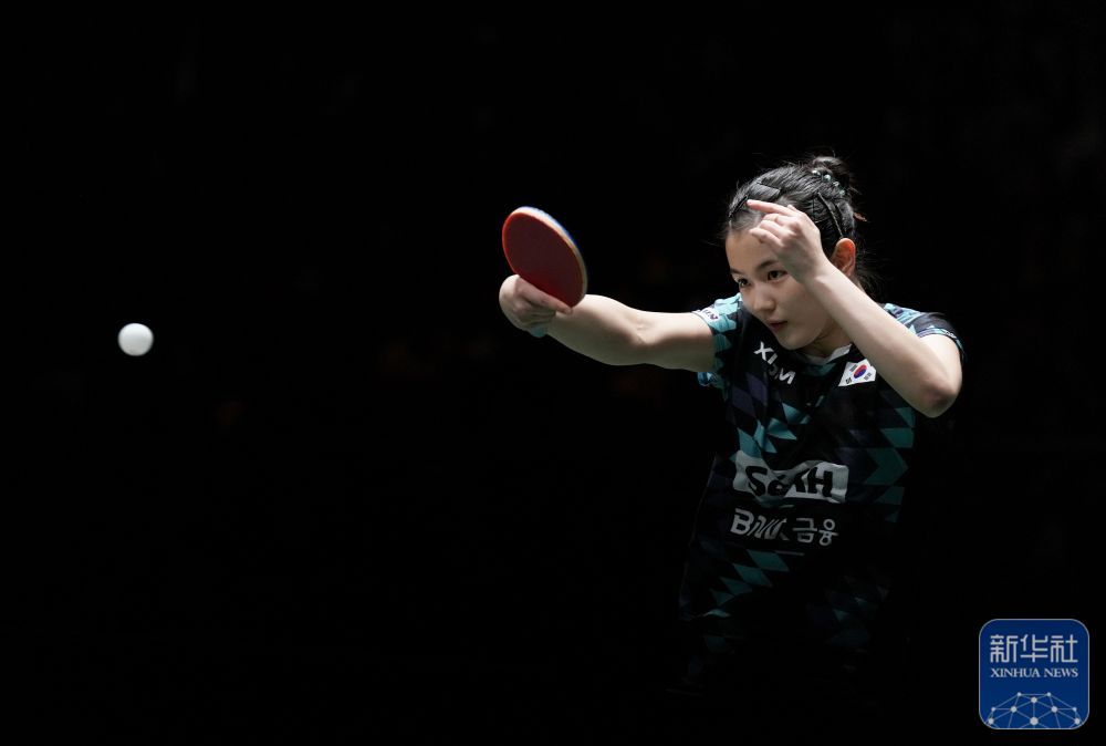 ↑ 韩国队选手金娜英在女单比赛中回球。体世她1比2不敌中国队选手蒯曼。界杯级决新华社记者 王迎 摄