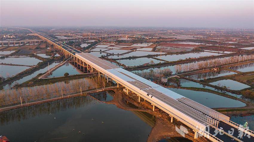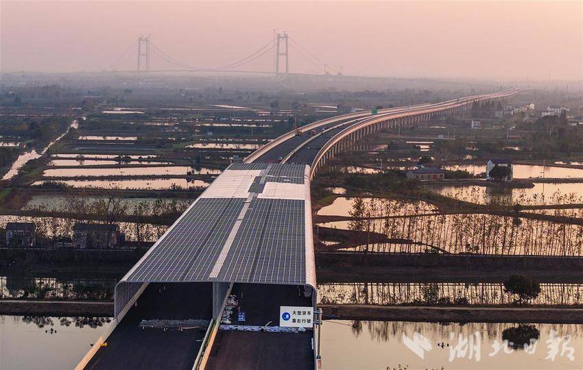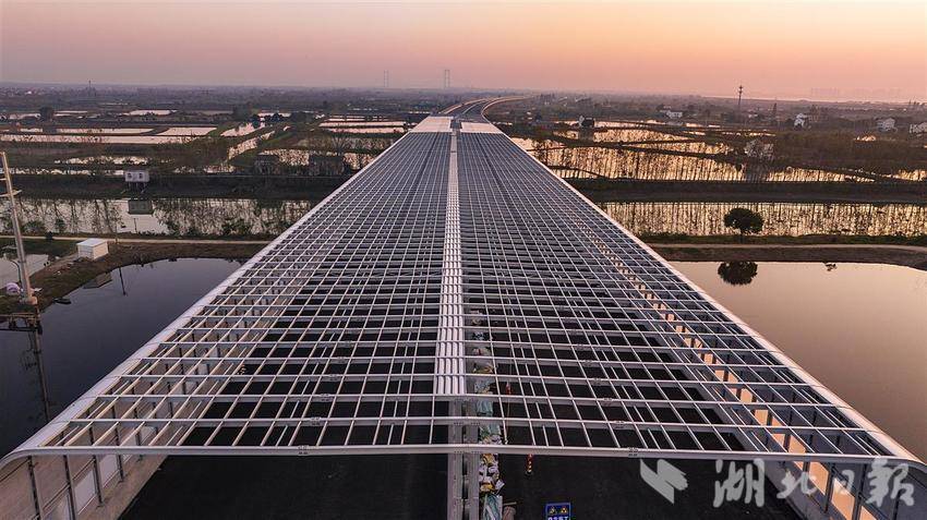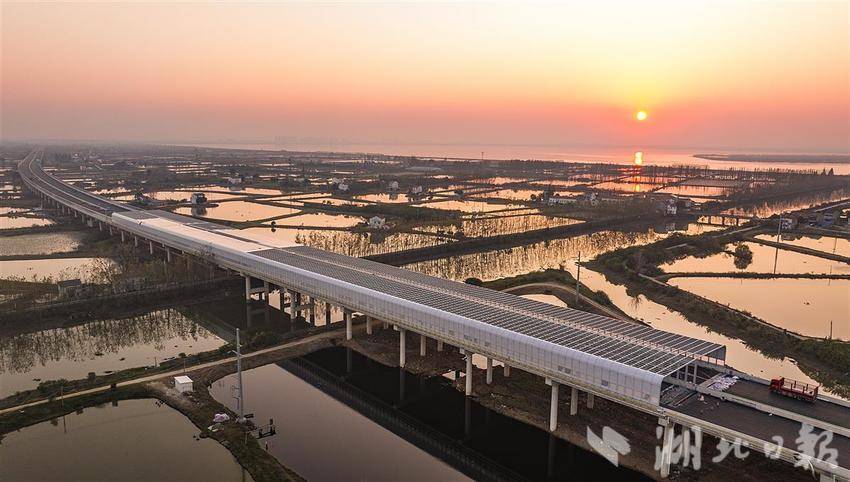 11月21日,夕阳西下,武汉市双柳长江大桥主桥北端全封闭式声屏障美如画。