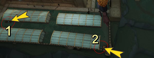 3、波特飞到左侧两个大棚中间,魔法找到第一个蓝色颜料。
