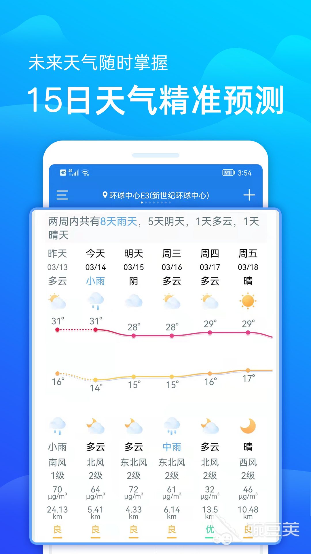 在这个APP上大家可以查询未来15天的天气预报情况以及空气质量风力情况。而且他还给大家提供了各大城市的空气质量排行榜,以及每天的生活出行指南。是大家日常生活中掌握未来天气,以及气温发展情况的实用性工具。